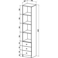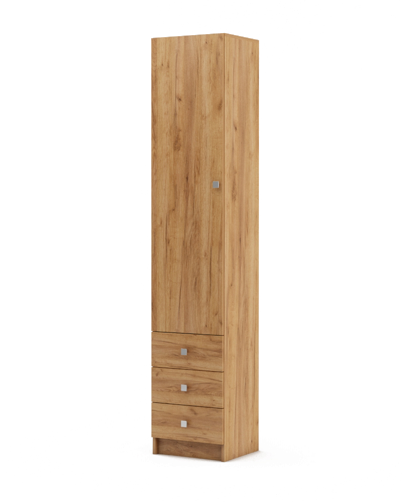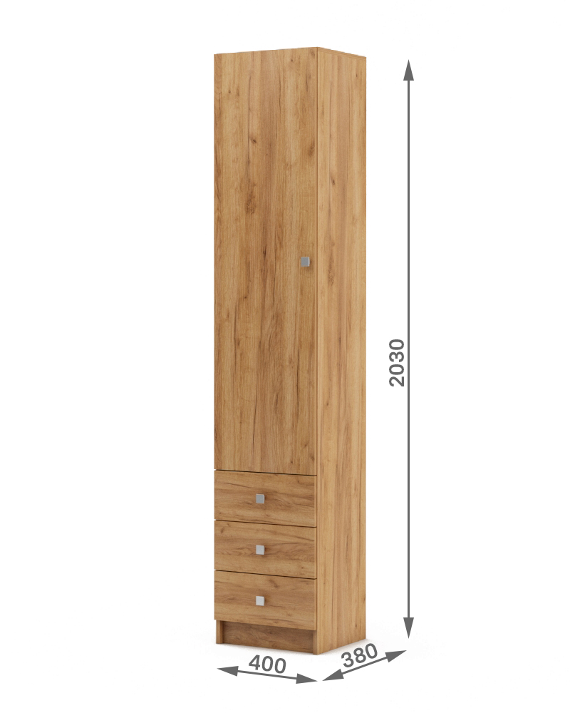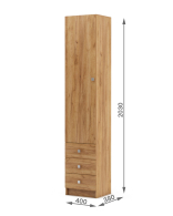 Функциональность: Шкаф оснащен распашным отделением с четырьмя полками и тремя выдвижными ящиками, что позволяет удобно разместить одежду и мелкие вещи.