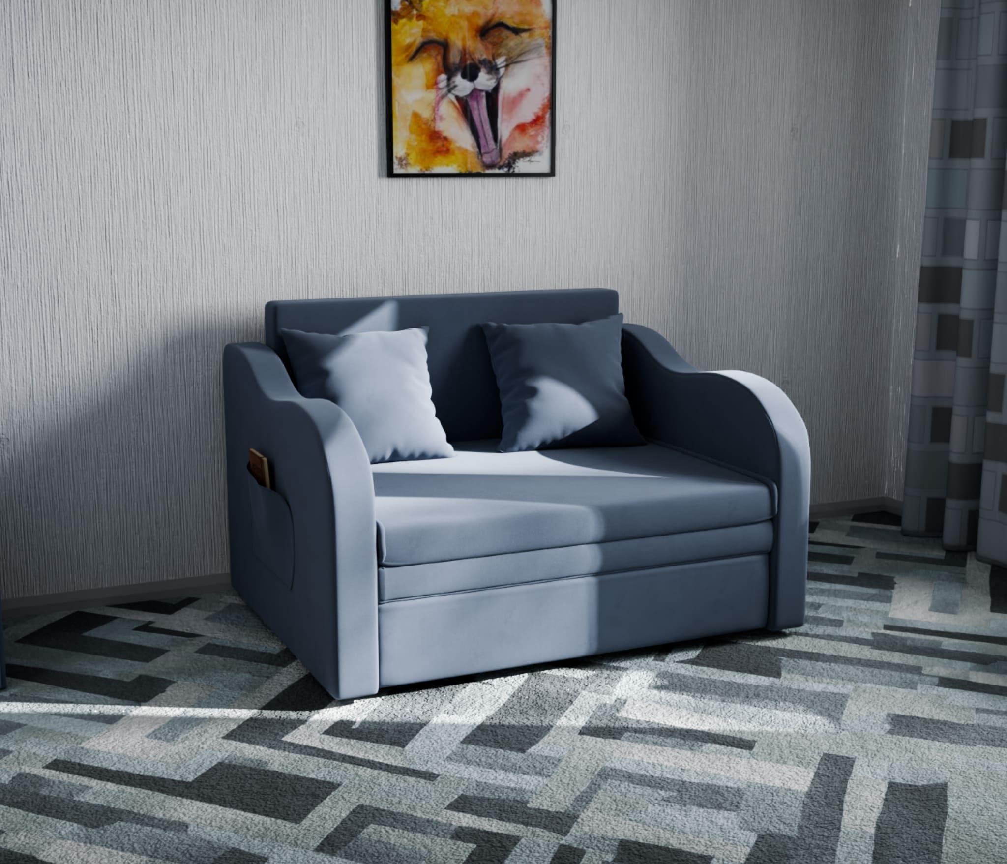 Механизм трансформации "выкатной" предельно прост в использовании и надежен, поэтому ваш ребенок легко справится с ним. Наполнитель из пенополиуретана обеспечивает комфорт и мягкость во время сна. Материал каркаса выполнен из массива дерева, фанеры, ДВП и ЛДСП, что делает диван прочным и долговечным.
