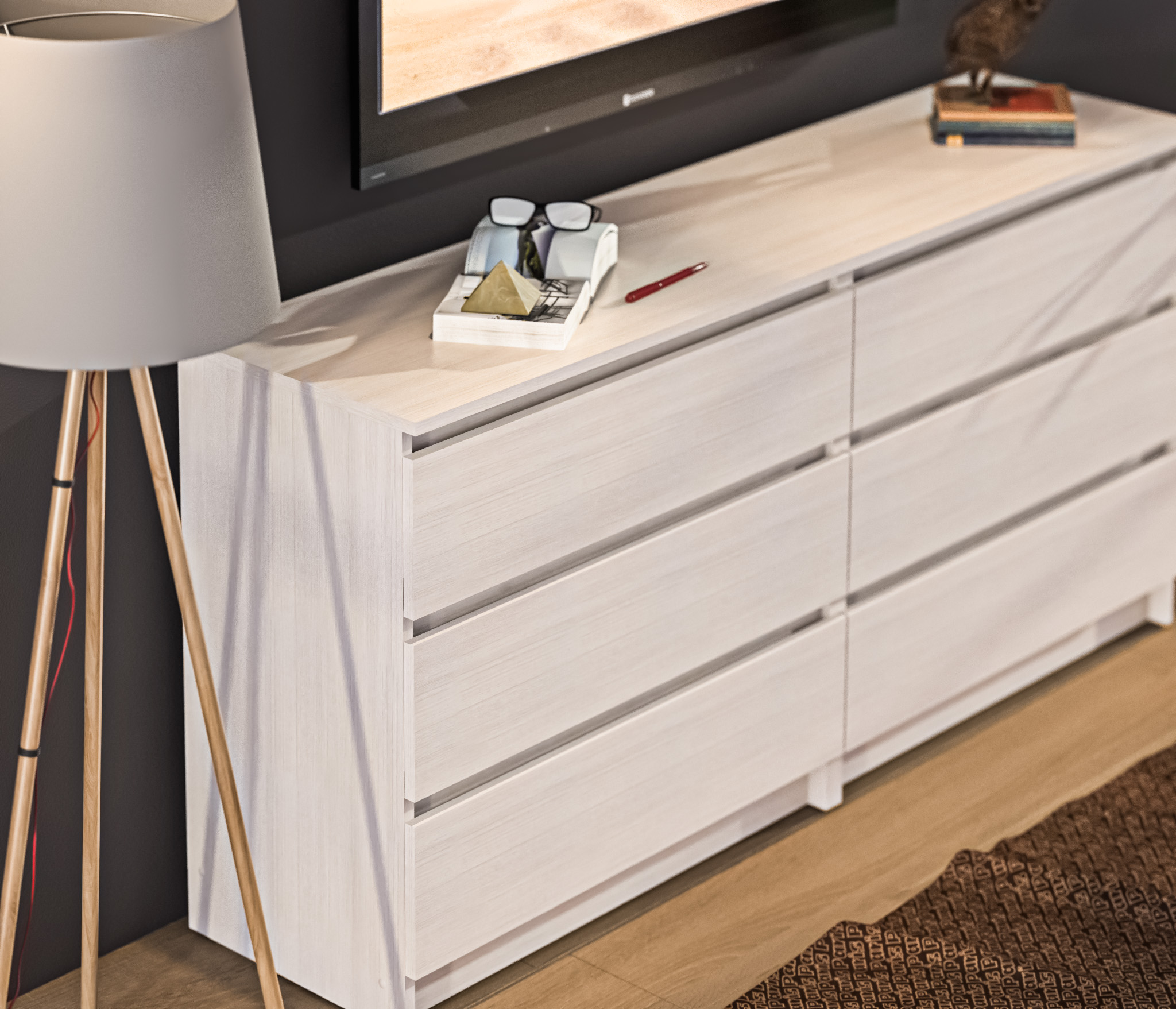 Комод с ящиками выполнен из ЛДСП: прочного и долговечного материала, который устойчив к механическим повреждениям. Мебель дополнена шестью вместительными ящиками, надежными механизмами открывания, а отсутствующие ручки делают модель более органичной и лаконичной.