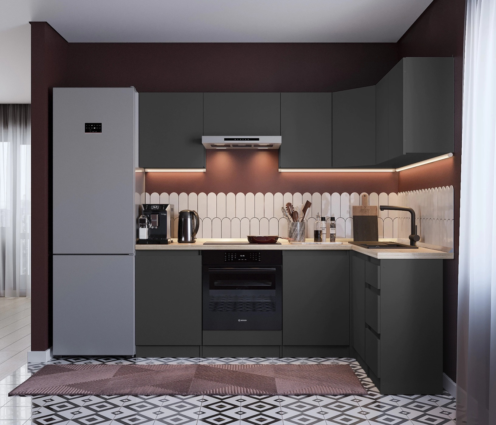 Столешница, стеновая панель, мойка, сушка и бытовая техника приобретаются отдельно.