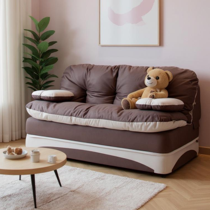 Раскладной диван легко трансформируется в полноценное спальное место. Для раскладывания необходимо просто отодвинуть его от стены и опустить спинку. Его можно использовать в качестве кровати для одного взрослого человека или как двухспальный диван кровать. Перина поможет организовать дополнительное спальное место или стать удобным игровым пространством для детей.