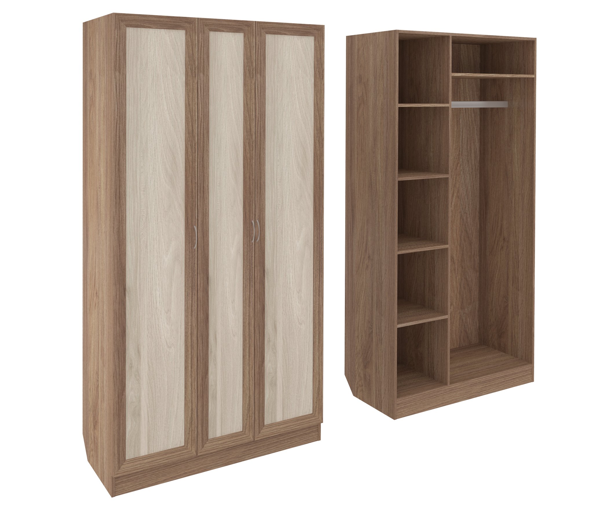Корпус шкафа выполнен из Ламинированной ДСП высокого качества с насыщенным цветом. Фасады выполнены из материала МДФ.Шириною 110 см., большая и функциональная трёхстворчатая модель. В левой секции ниши для сложенных вещей. Справа штанга для одежды.