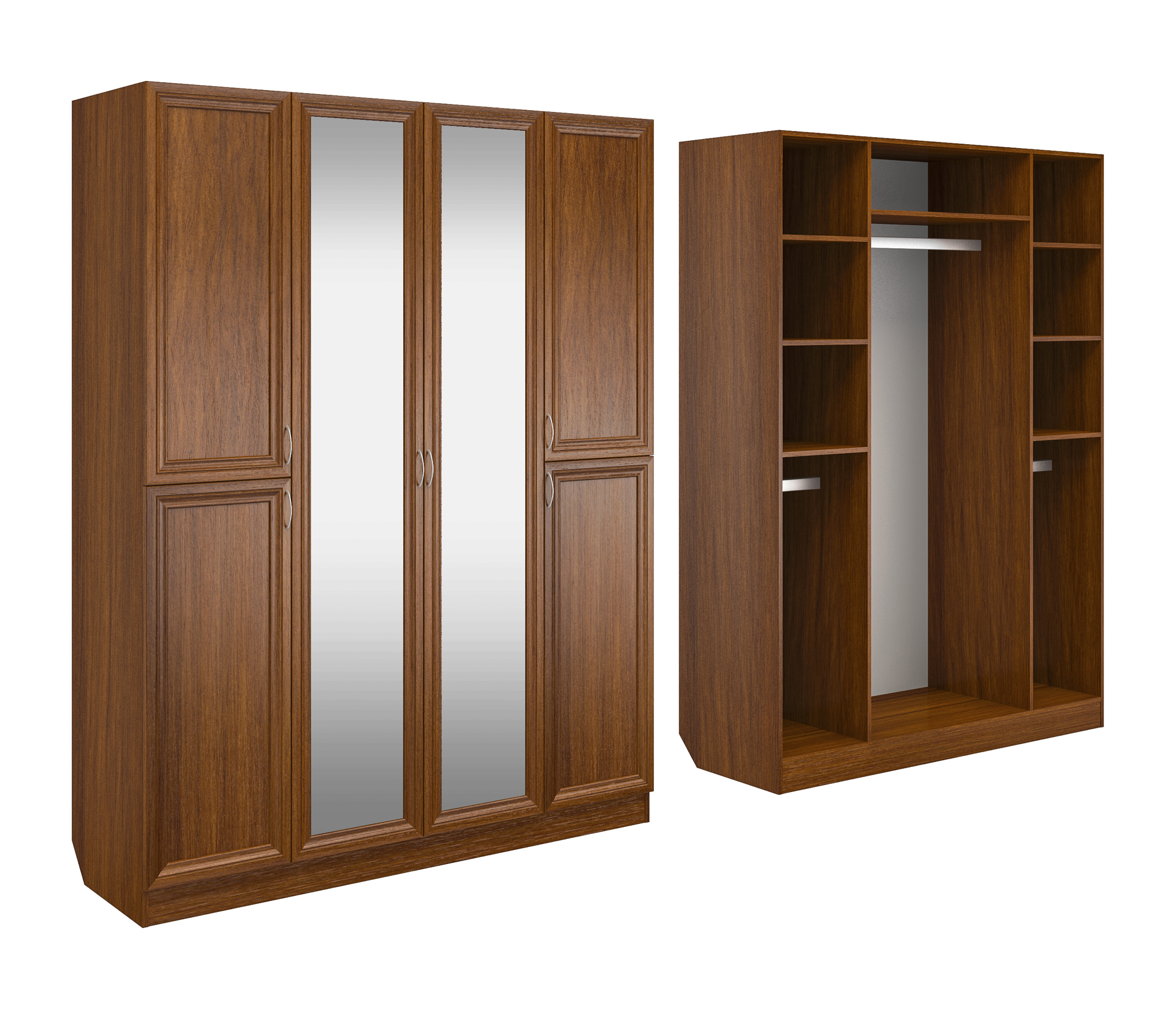 Корпус шкафа выполнен из Ламинированной ДСП высокого качества с насыщенным цветом. Фасады выполнены из материала МДФ.В данной моделе используются зеркала, которые внедрены в рамки фасадов.Шириною 160 см., красивый и большой четырехстворчатый шкаф. В центре 2 большие створки с зеркалами, за ними расположено большое отделение со штангой. Симметрично расположенные крайние отделения закрываются на верхние и нижние распашные двери. Вверху у каждого по три ниши, внизу по штанге. Два зеркала в данной моделе уже включены в стоимость.