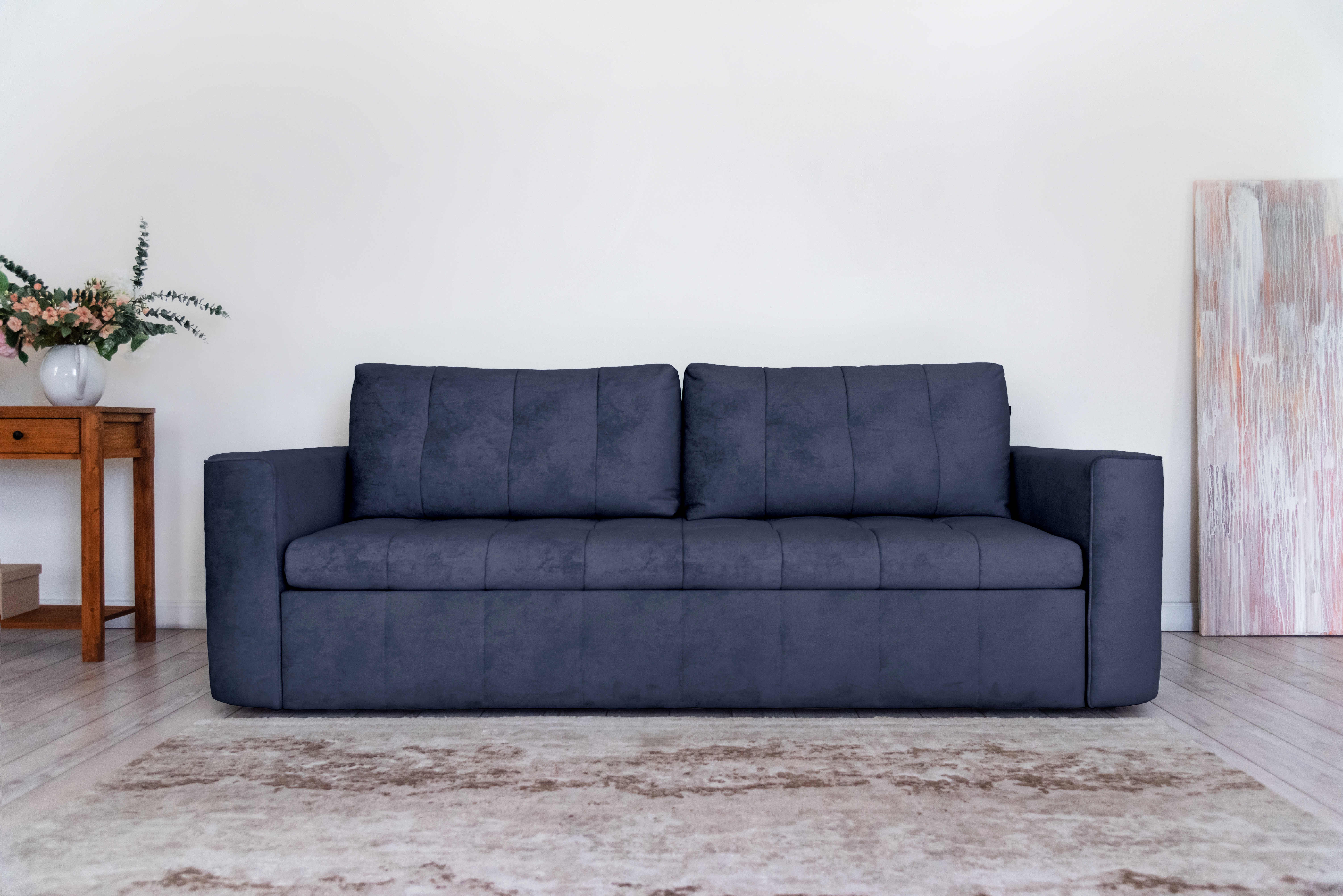 Стильный прямой диван BOSTON создан для тех, кому важна практичность и комфорт: надежный металлокаркас, мягкие ткани и быстрая трансформация в спальное место! Спинка защищает от соприкосновения со стеной во время сна.