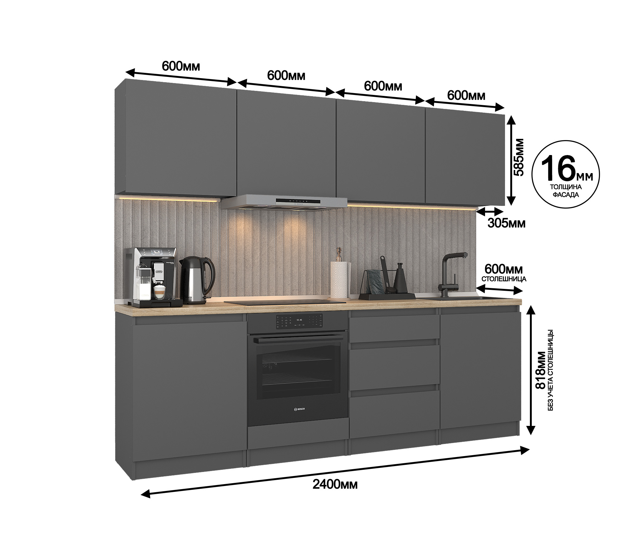 Обратите внимание, что столешница, стеновая панель, мойка и смеситель не входят в комплектацию кухни Леон и приобретаются отдельно. Это позволяет вам выбрать идеальные аксессуары и элементы для создания индивидуального дизайна вашей кухни.