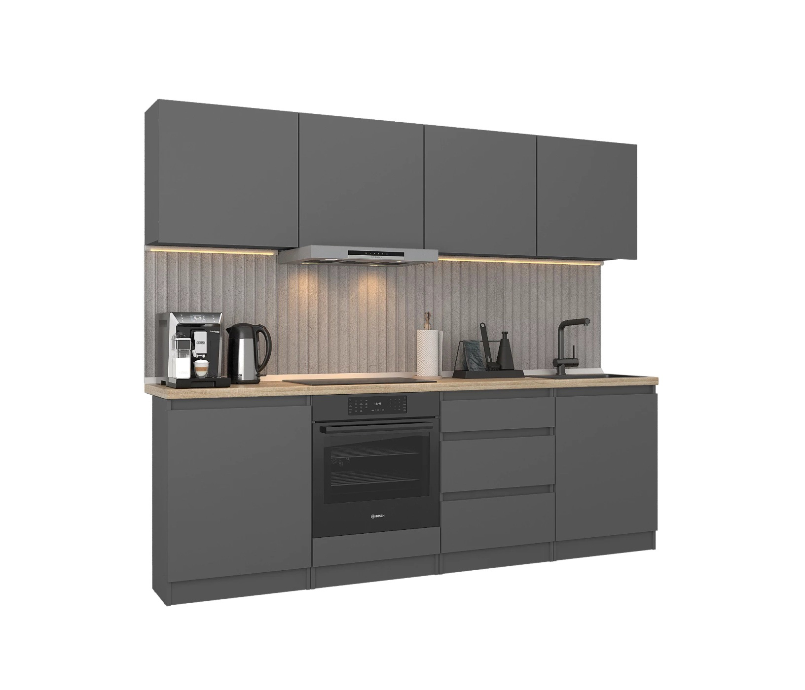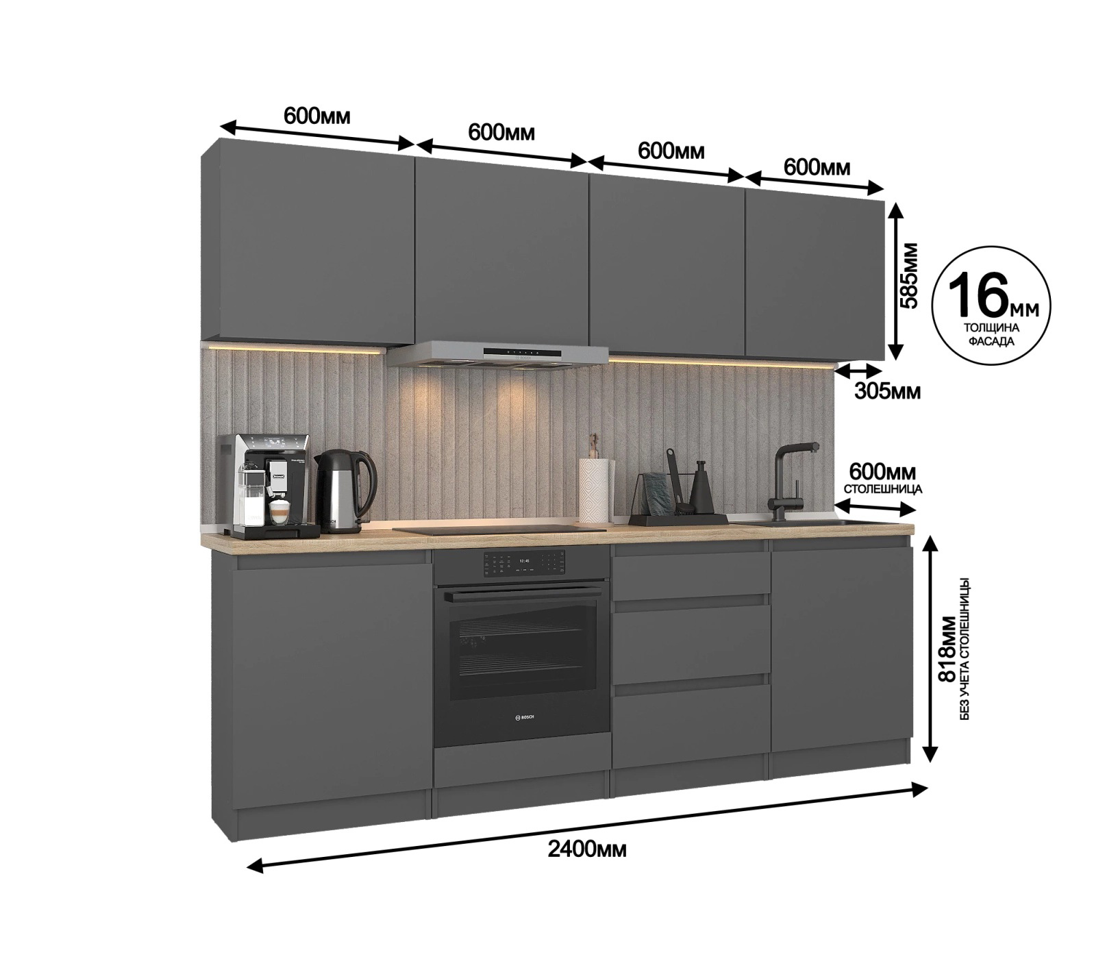 Обратите внимание, что столешница, стеновая панель, мойка и смеситель не входят в комплектацию кухни Леон и приобретаются отдельно. Это позволяет вам выбрать идеальные аксессуары и элементы для создания индивидуального дизайна вашей кухни.