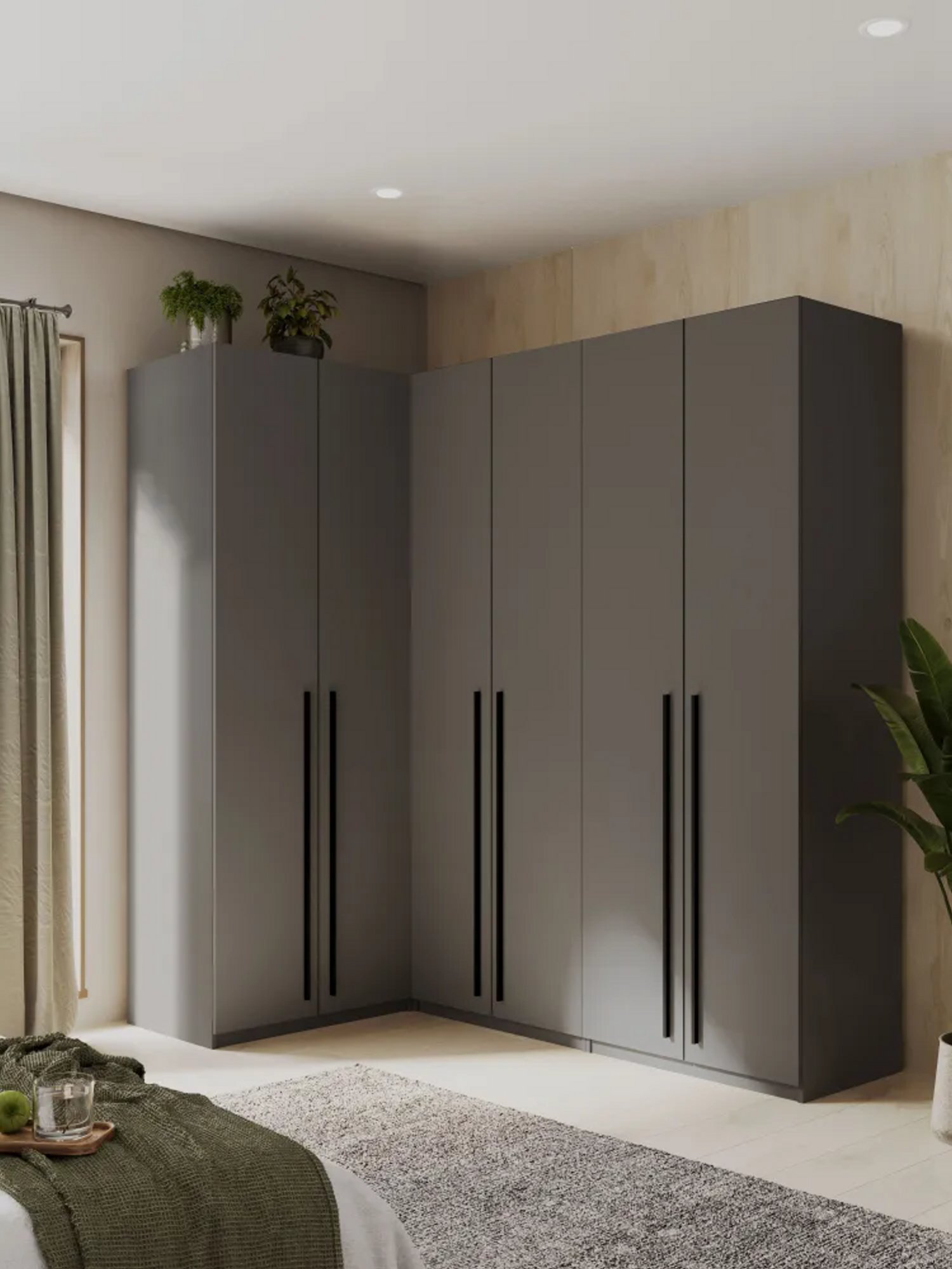 Обладая габаритами 2200х2100х1300 мм, этот угловой шкаф помогает эффективно использовать пространство, идеально подходя для уголков комнаты. Две распашные двери обеспечивают легкий доступ к одежде. Внутреннее пространство организовано разумно: здесь есть несколько полок для одежды и ящики, которые идеально подходят для хранения мелочей.