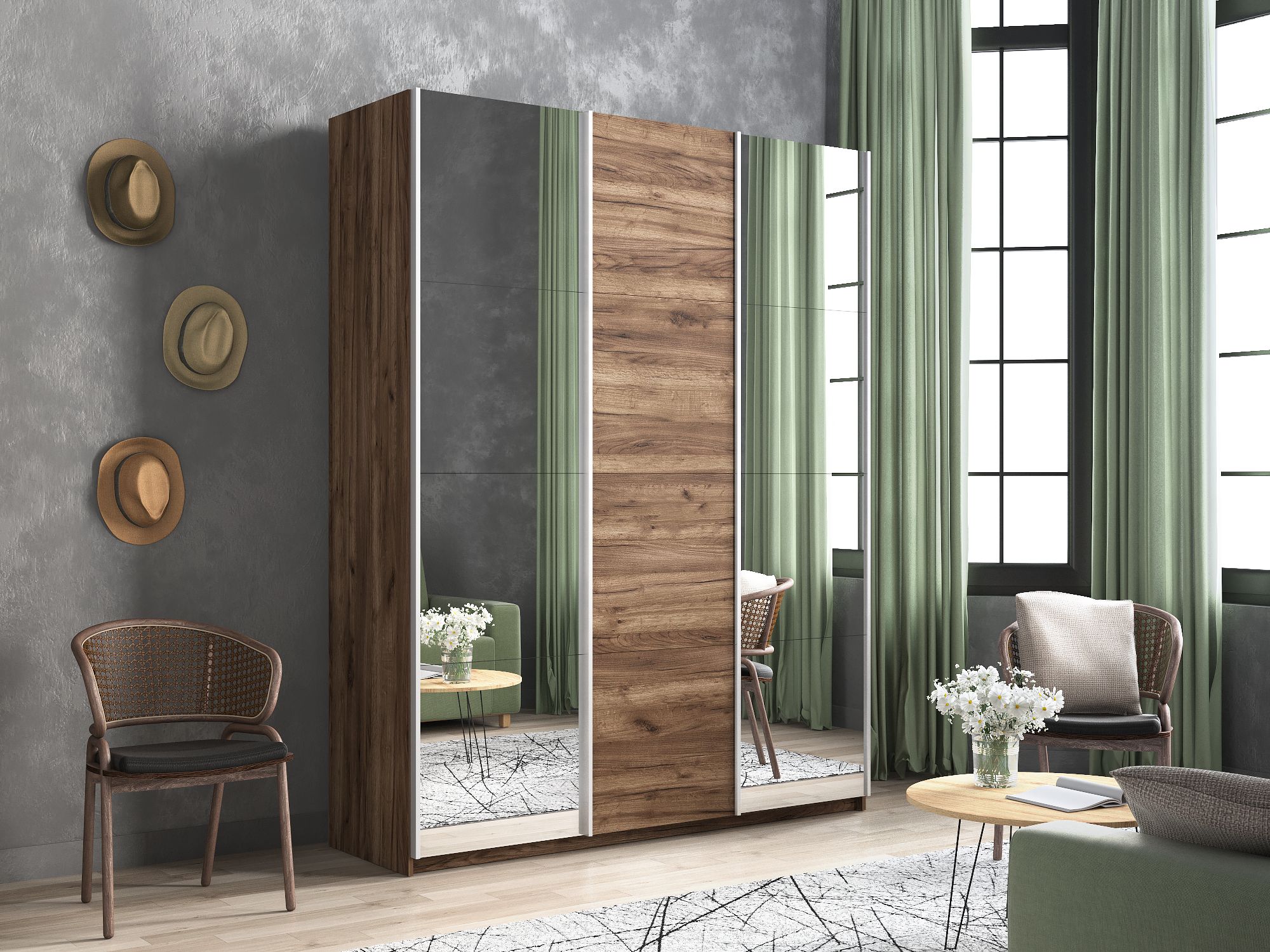 Шкаф Прайм трио 1ДСП+2 зеркало 2300х2100х570 (Дуб/крафт/табак)