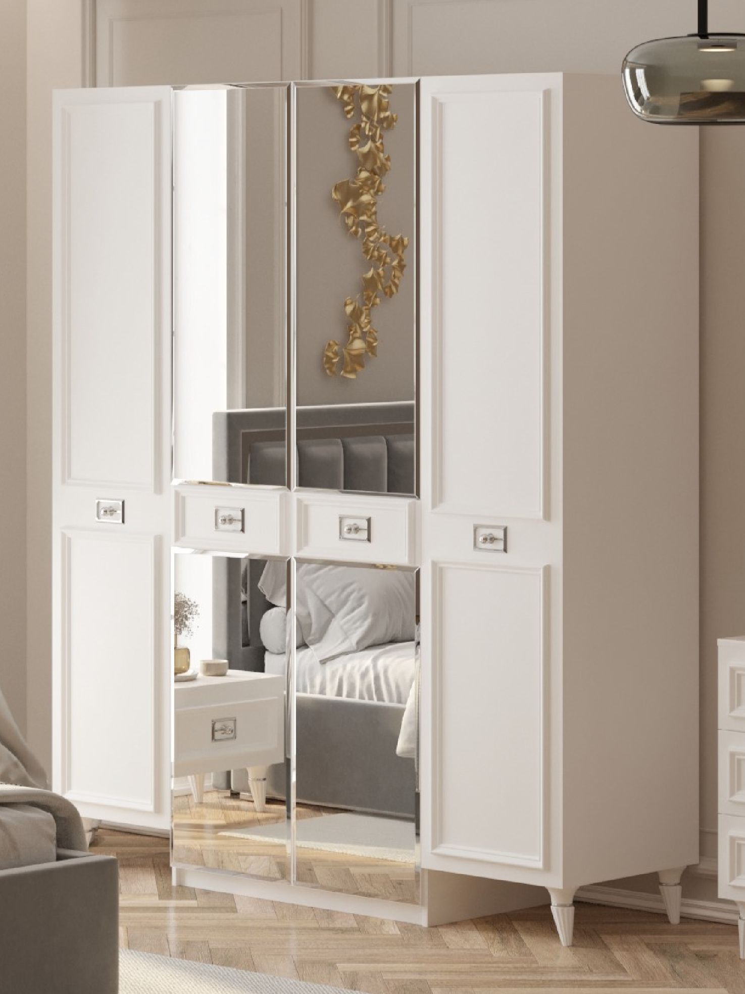 Этот шкаф легко впишется в спальню любого стиля, добавляя атмосферу роскоши и утонченности. Он подчеркнет вашу индивидуальность и стиль, придавая вашему пространству неповторимый характер. Создайте привлекательное и организованное пространство с помощью этого шкафа в стиле неоклассика, который является не просто мебелью, но и источником вдохновения и изыска.