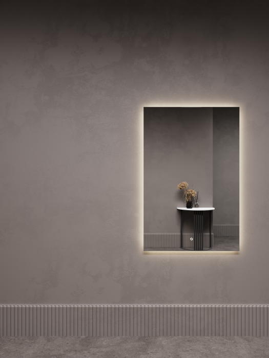 Безрамное зеркало прямоугольной формы с контурной (тыльной) подсветкой 3 в 1. Зеркало установлено на высококачественной подложке из пластикового профиля, что обеспечивает прочность и стабильность. Светодиодная лента защищена матовым свето-рассеивателем от попадания пыли и влаги. Есть вывод 220W для подключения к сети, включение подсветки от сенсорной кнопки на зеркале, её расположение на зеркале можно выбрать на заказ.