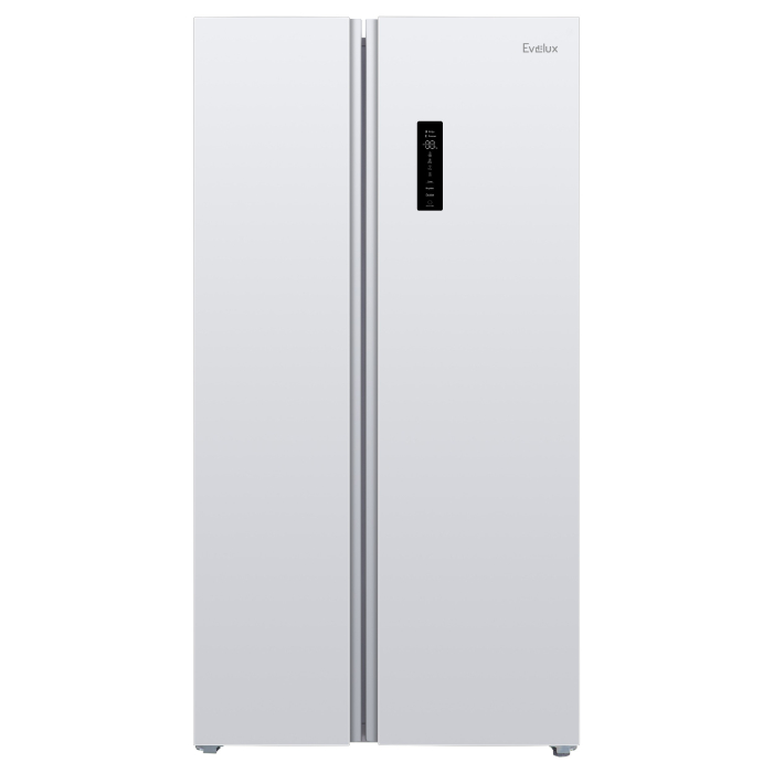 Холодильник Side-By-Side, Инверторный компрессор, Электронное управление с внешним дисплеем, Система авторазморозки NO FROST,Динамическое охлаждение холодильного отделения, Общий полезный объем: 488 л,объем холодильного отделения – 324 л, объем морозильного отделения – 164 л, Мощность замораживания 12кг/24ч,Супер-заморозка,Блокировка панели управления,5 полок из закаленного стекла и 4 прозрачных дверных полки в холодильном отделении,Ящик для овощей и фруктов,Ящик в морозильном отделении,Класс энергопотребления А+,Уровень шума 42дБ, Скрытые ручки, габариты (ВхШхГ): 1768x920x630 мм, цвет - белый.