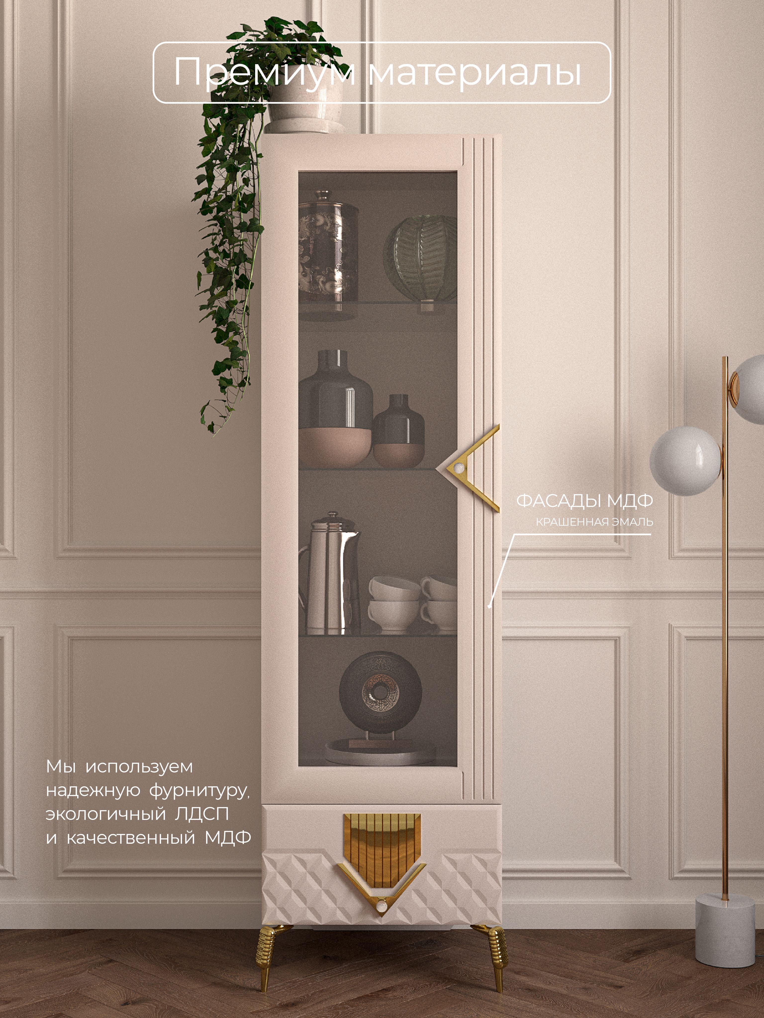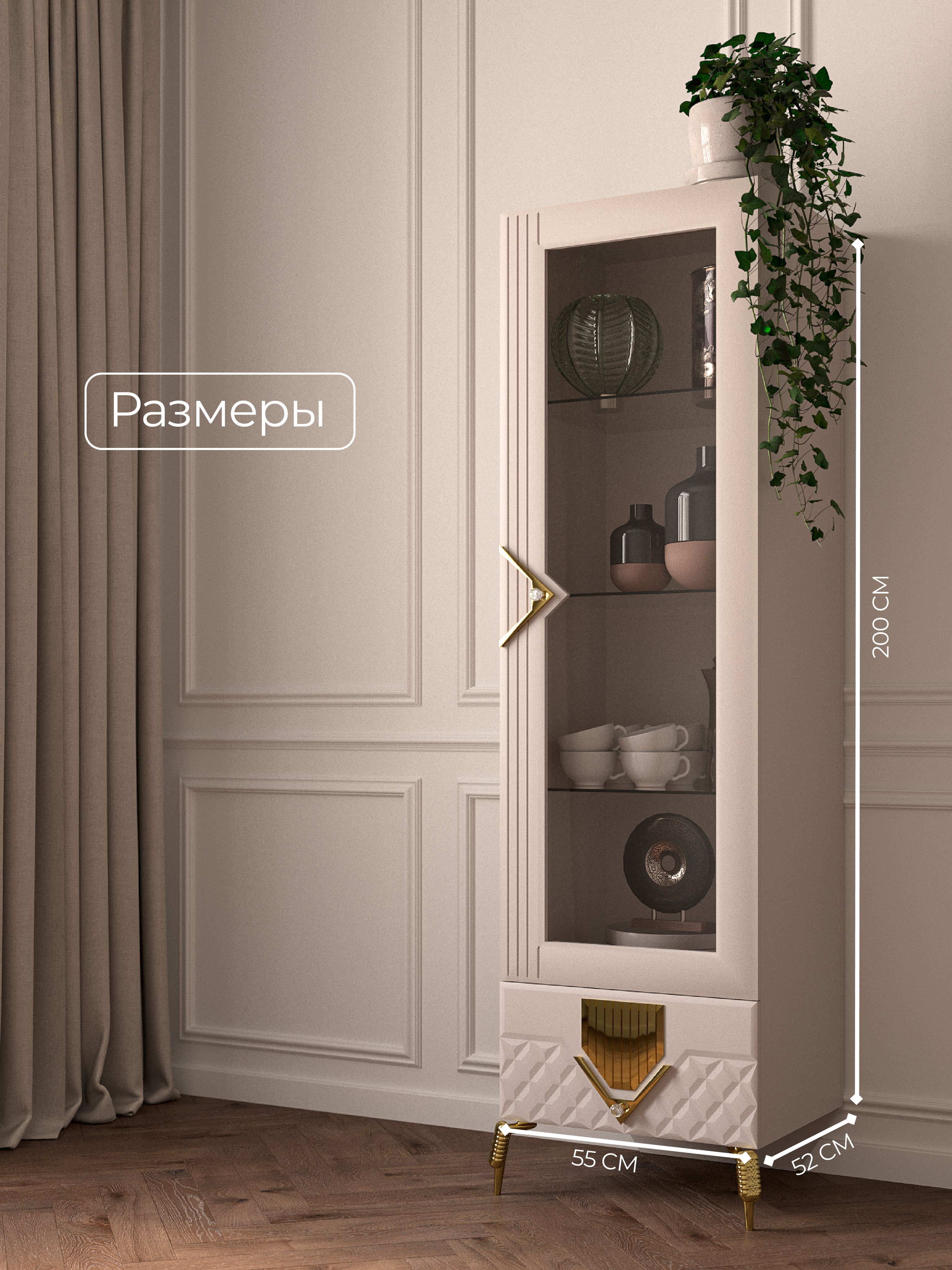 Шкаф 1-дверный «Савелья» в цвете «кашемир-серебро» выполнен в классическом стиле, что делает его универсальным для любого интерьера. Стеклянные элементы добавляют изящества и визуально расширяют пространство. Дверца открывается легко и плавно, обеспечивая удобный доступ к содержимому.Внутреннее пространство шкафа с распшашной дверцей, включает ящики для хранения различных предметов — от мелочей до более крупных вещей. Это делает его идеальным вариантом как для сервантов, буфетов, так и для книжных полок. Вы сможете удобно разместить в нем все необходимые вещи, сохранив порядок и организованность. Его элегантные формы и нежный оттенок «кашемир-серебро» гармонично вписываются в вашу гостиную или столовую.Данная мебель станет настоящей находкой для любителей минимализма и функциональности в интерьере, так как шкафчик узкий. Одностворчатый дизайн позволяет использовать шкафчик даже в небольших помещениях без потери стиля. Закрытое хранение помогает защитить ваши вещи от пыли, а застекленные двери дают возможность продемонстрировать ваш уникальный вкус. Будь то коллекция посуды или библиотека с книгами — этот напольный шкаф-пенал предложит вам удобное решение для организации пространства. Каждая чашка, каждая тарелка будет сверкать в лучах света, отражаясь от серебристого оттенка шкафа. Наслаждайтесь гармонией эстетики и практичности с этим красивым элементом мебели!Однодверный шкаф-витрина – это не просто функциональный предмет мебели, а изысканное дополнение к вашему интерьеру. Он создан, чтобы дарить уют и красоту, а его долговечность гарантирует, что он будет радовать вас долгие годы.«Савелья» - это не просто место для хранения, это элемент декора, который привносит в ваш дом атмосферу тепла и гостеприимства. Он будет притягивать взгляды и вызывать восхищение у ваших гостей. Прочность и качество материалов, из которых изготовлен шкаф, гарантируют его надежность и долгий срок службы. Вы сможете наслаждаться его красотой и функциональностью долгие годы, передавая его из поколения в поколение.