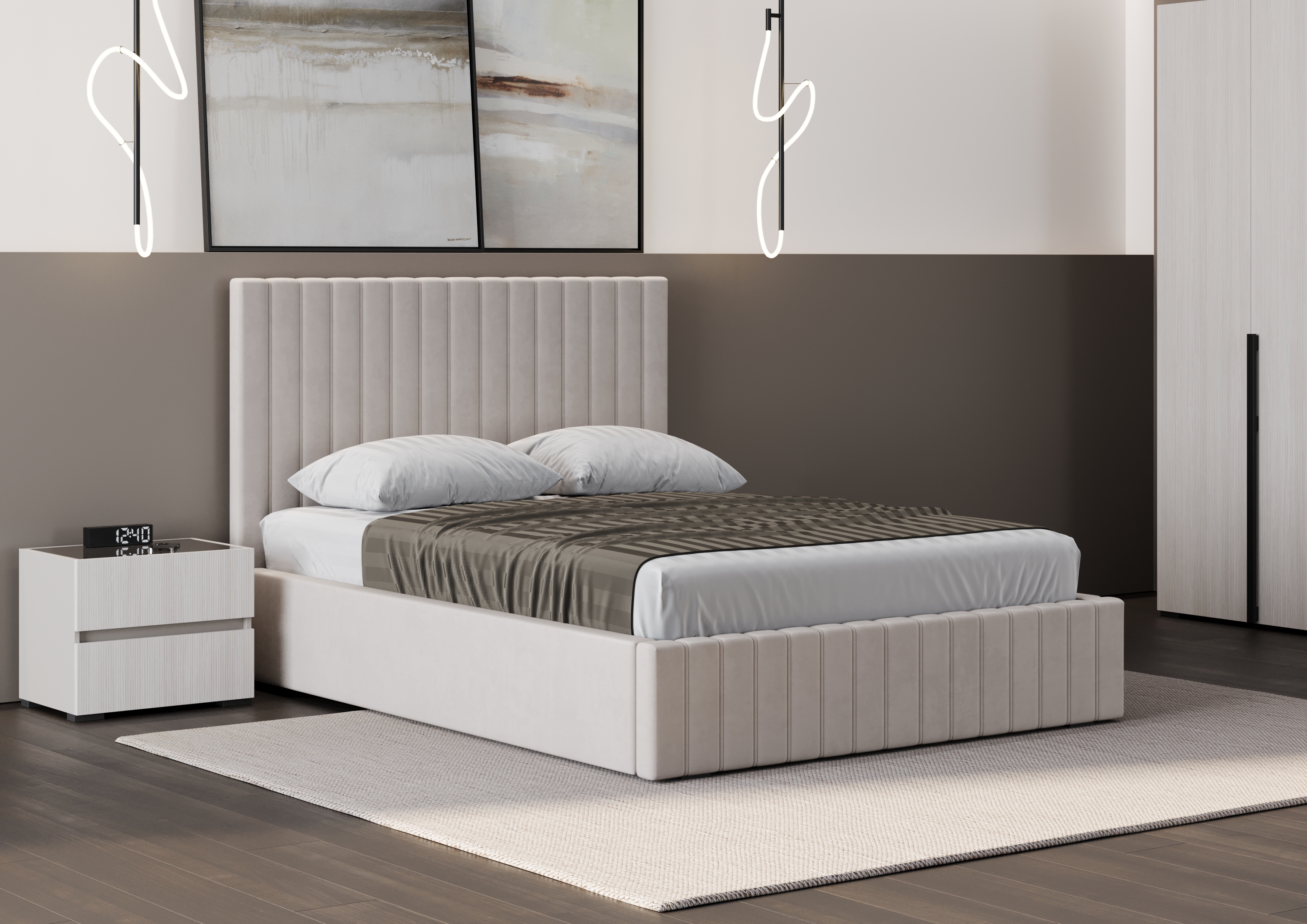 Кровать двухспальная в современном стиле.Эта стильная двухспальная кровать станет ярким акцентом в вашем интерьере, сочетая современный минимализм и высокую практичность. Благодаря использованию антивандальной ткани велюр, кровать устойчива к повреждениям и загрязнениям, обеспечивая долгий срок службы. Её утончённый дизайн идеально впишется в различные стили, создавая атмосферу уюта и комфорта.