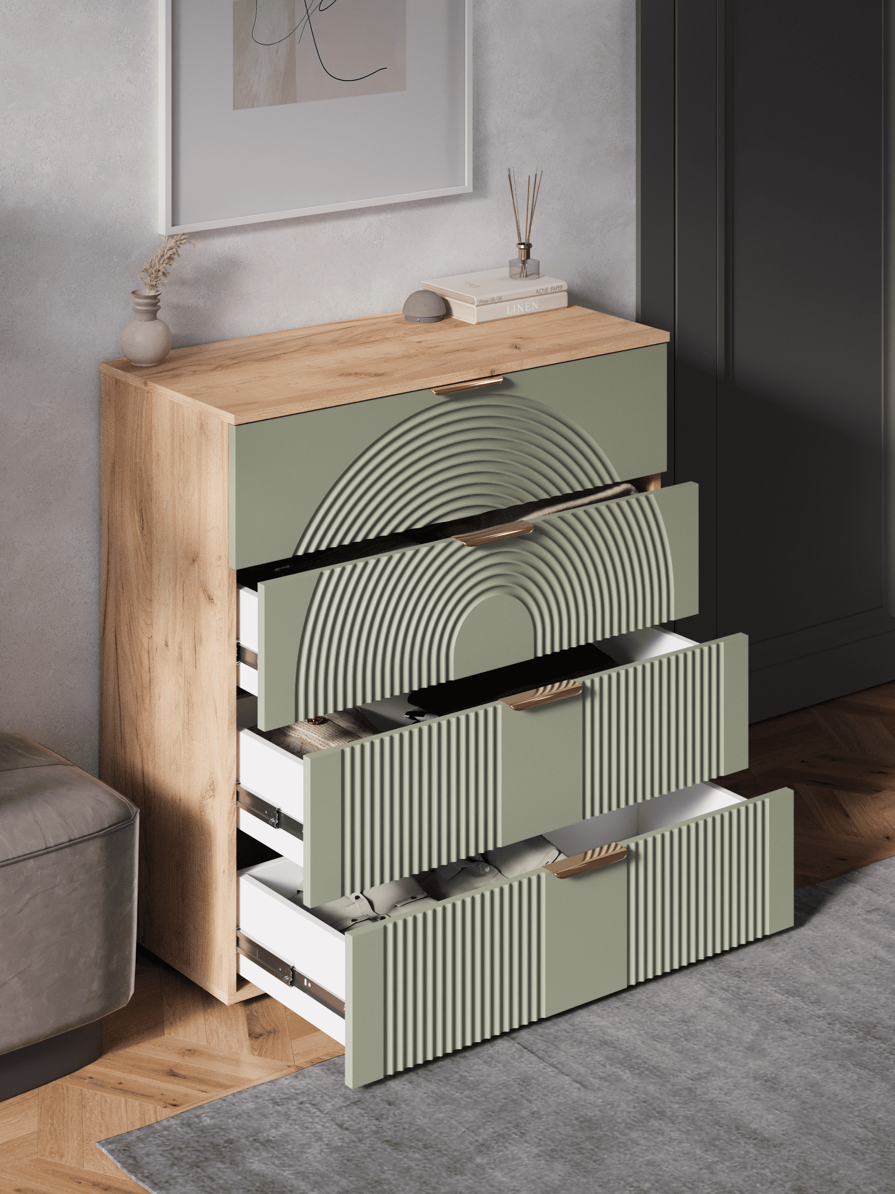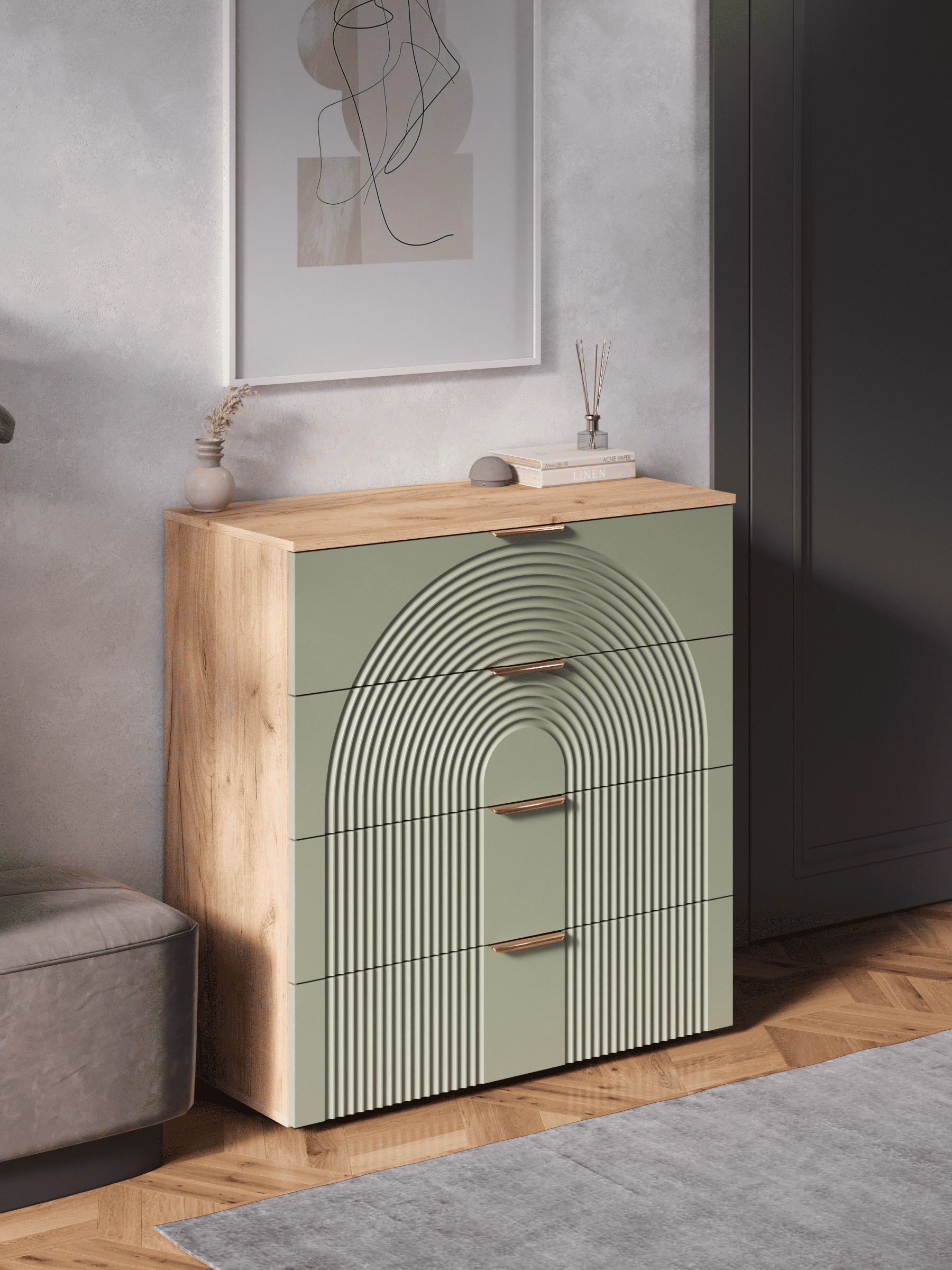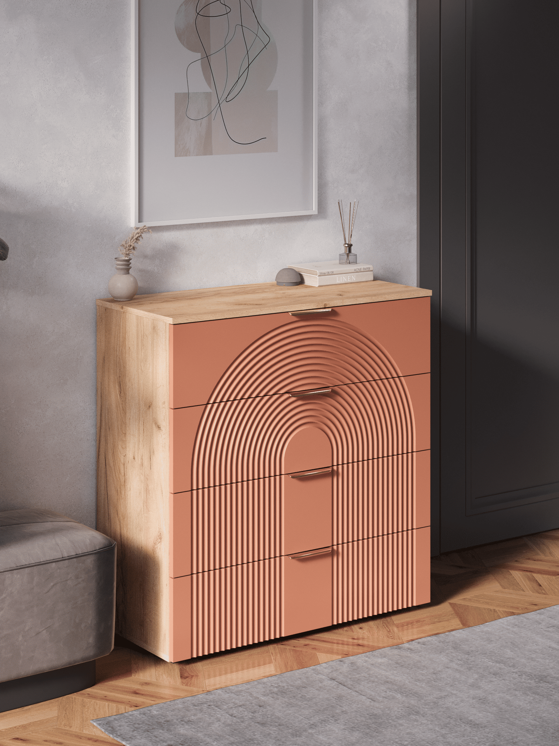 Стильный и практичный комод с ящиками, решит как минимум две ваших задачи, будет служить многофункциональной нишей для хранения вещей, одежды, белья и универсальной подставкой для различных предметов интерьера, а также можно использовать в виде тумбы под телевизор. Наша коллекция Ингрия российского производства выглядят легко и современно, идеально впишется в лофт, скандинавский, современный, минимализм и прочие популярные стили интерьеров. Его минималистичный дизайн придаст легкость и простор всему вашему интерьеру. Комод компактный и сэкономит пространство и организует грамотное хранение вещей. Комод имеет 4 выдвижных ящика. За удобство и комфорт открывания ящиков отвечают шариковые направляющие (без доводчиков), с полным выдвижением. Ящики с такой системой открывания будут ходить практически бесшумно, и выдвигаться полностью, даже при повышенной нагрузке. Ножки изготовлены из прочного массива дерева. Комод изготовлен из материалов высокого качества. За высокопрочность и долговечность отвечает корпус, выполненный из ЛДСП, подходит для активного использования. За эстетику и лаконичность дизайна отвечает фасад из МДФ созданный путем сложной фрезеровки в виде 3D рисунка. Накладные алюминиевые ручки для комода подчеркнут монолитный образ. Комод поставляется в разобранном виде, пусть это вас не пугает. В комплекте предусмотрены все необходимые комплектующие, подробная инструкция и фурнитура. Сборка комода серого с ящиками не потребует особых навыков и не отнимет много времени. Современная мебель для дома должна не только брать на себя пару задач по организации пространства, но и гармонично смотреться, выполняя нужные нам функции. Поэтому комод можно использовать в разных помещениях в гостиной, спальне, прихожей (коридоре), в детской для игрушек, в офисе, в салоне красоты, на балконе. Комод для вещей справится со всеми возложенными на него функциями. Перед отправкой мебели, каждое изделие проходит проверку на наличие брака. Для целостности и сохранности каждого изделия мы разработали усиленную, надежную упаковку. Европейское качество от российского производителя - по доступным ценам.