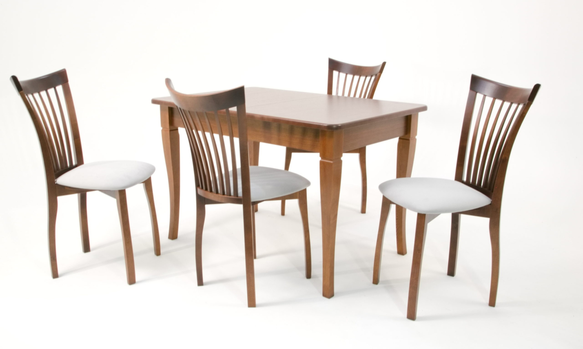 Комплект из деревянного стола Моцарт на каркасе из натурального дерева и 4 стульев Миранда отлично подойдет к интерьеру, выдержанному в классическом или софременном стиле. Данный комплект станет центральным элементом в гостиной, столовой зоне, на кухне, позволив создать уютное обеденное место, где смогут собираться члены дружной семьи и их гости.У модели скругленные углы столешницы. Такое решение исключит риск сколов и обеспечит безопасность, в том числе, детям.Комплект выполнен в красивом  цвете - орех. Сочетание изысканного дизайна и высокого качества исполнения - главная особенность комплекта.Столешница выполнена из материалов с великолепными эксплуатационными свойствами - МДФ (Материал создается на основе натуральной древесины. Практичен, надежен, имеет однородную гладкую структуру), шпон.Мебель проста в уходе - для поддержания первозданного вида достаточно использовать простую чуть влажную салфетку по мере необходимости.