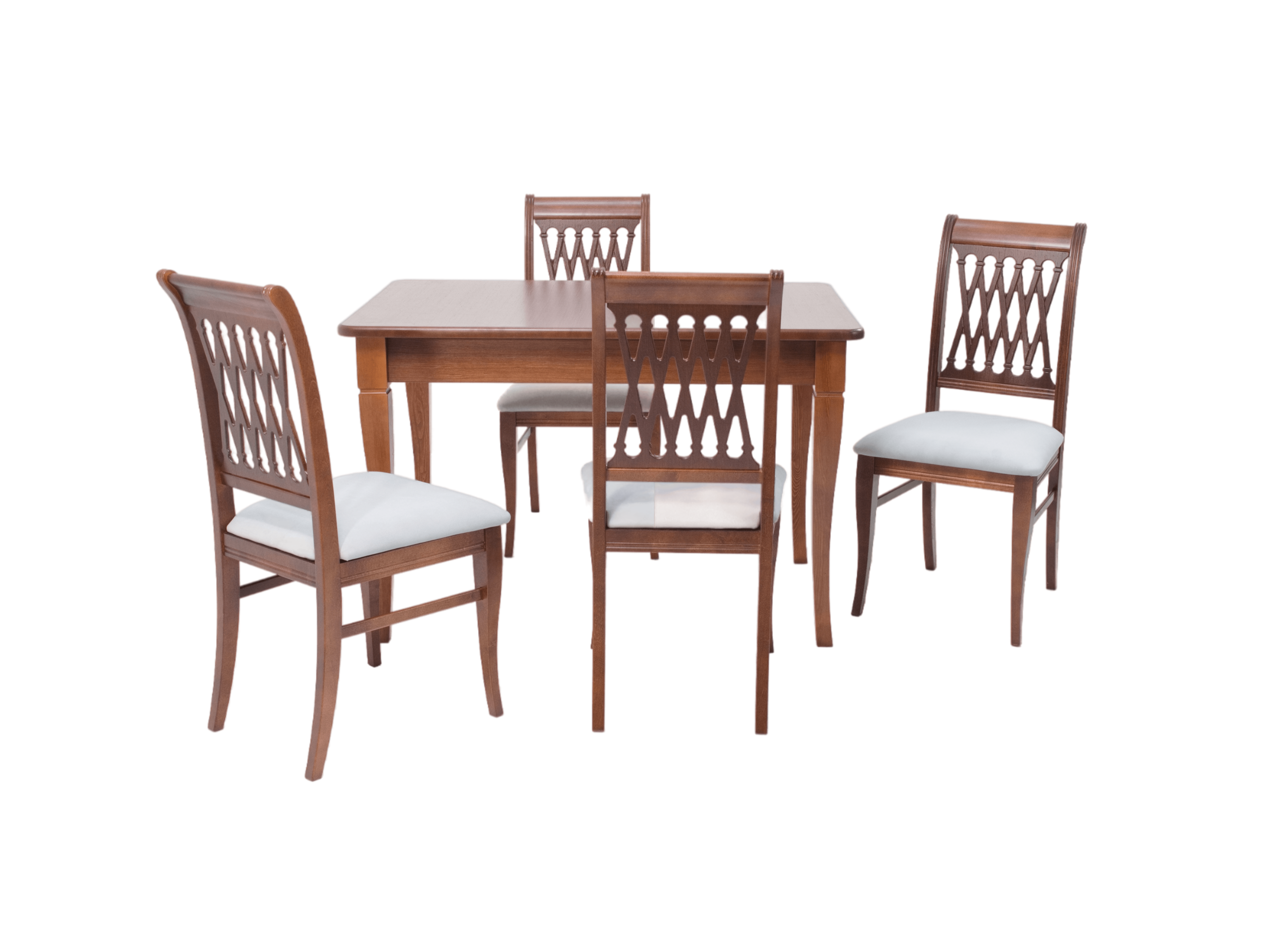 Комплект из деревянного стола Моцарт на каркасе из натурального дерева и 4 стульев Рич отлично подойдет к интерьеру, выдержанному в классическом или софременном стиле. Данный комплект станет центральным элементом в гостиной, столовой зоне, на кухне, позволив создать уютное обеденное место, где смогут собираться члены дружной семьи и их гости.У модели скругленные углы столешницы. Такое решение исключит риск сколов и обеспечит безопасность, в том числе, детям.Комплект выполнен в красивом  цвете - орех. Сочетание изысканного дизайна и высокого качества исполнения - главная особенность комплекта.Столешница выполнена из материалов с великолепными эксплуатационными свойствами - МДФ (Материал создается на основе натуральной древесины. Практичен, надежен, имеет однородную гладкую структуру), шпон.Мебель проста в уходе - для поддержания первозданного вида достаточно использовать простую чуть влажную салфетку по мере необходимости.