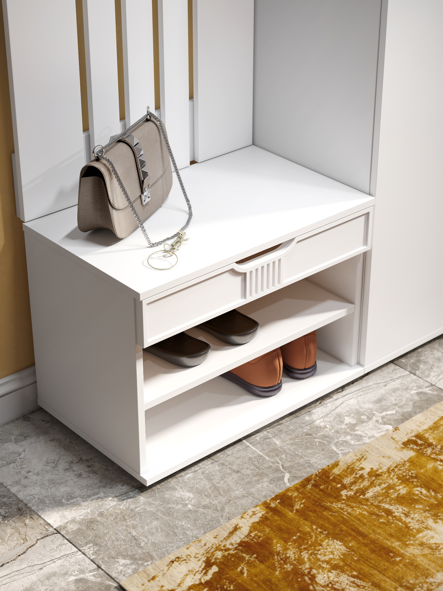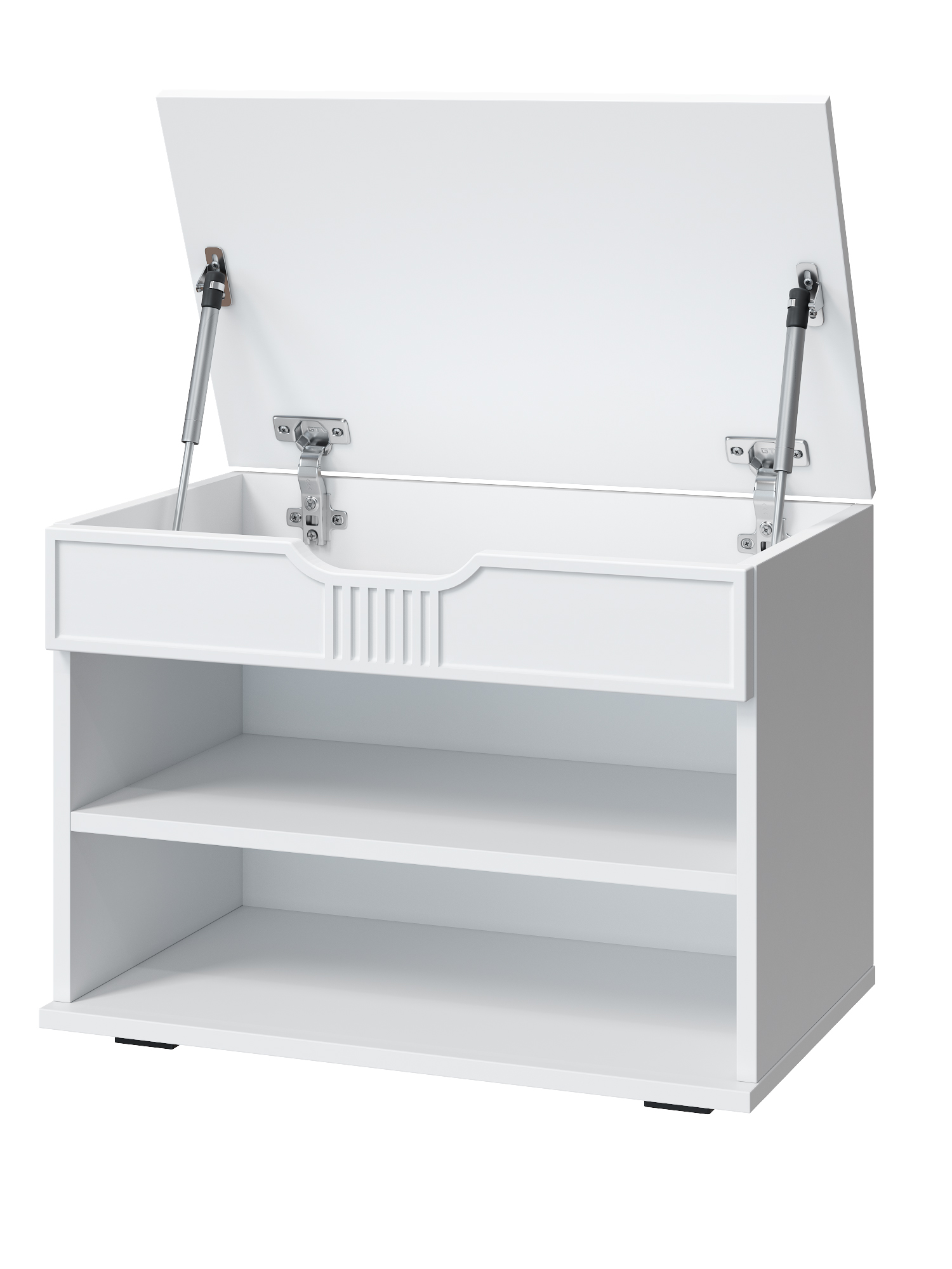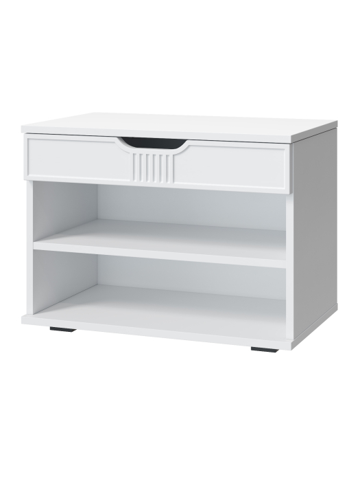 Тумба для обуви Эмилия ЭЛ-44 – компактная модель для комфортного переобувания в прихожую. Лаконичное изделие оборудовано двумя полками для обуви и сиденьем, под которым находится удобный ящик для хранения чистящих средств, щеток или зонта. Высота опоры 20 мм.