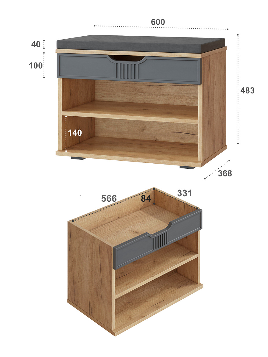 Тумба для обуви Эмилия ЭЛ-44К – компактная модель для комфортного переобувания в прихожую. Лаконичное изделие оборудовано двумя полками для обуви и мягким сиденьем, под которым находится удобный ящик для хранения чистящих средств, щеток или зонта. Ткань мягкой части велюр, наполнение: поролон 40 мм, синтепон, белый флизелин. Высота опоры 20 мм.