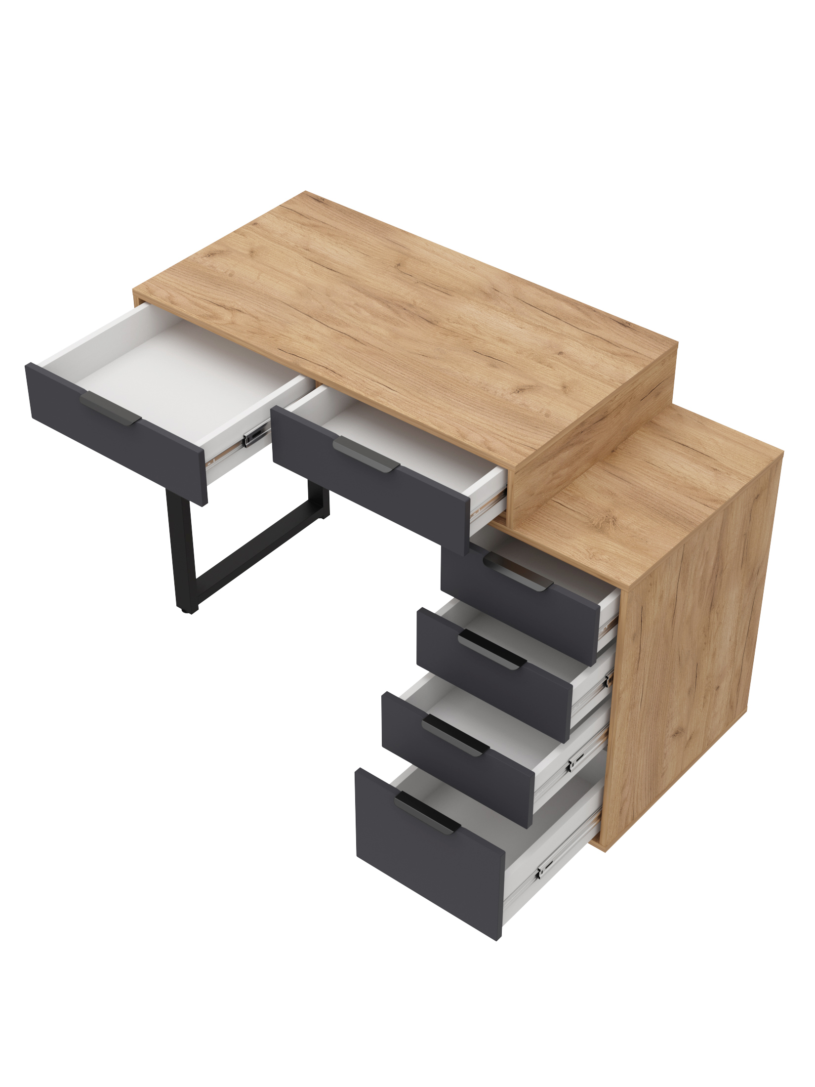 Универсальность: подходит для использования в качестве письменного, компьютерного или маникюрного стола. Рекомендуется высокий стул. Фурнитура: телескопические направляющие полного выдвижения без доводчиков, металлические ручки и опора.