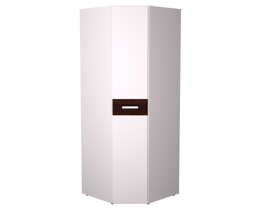 Норвуд 156 Шкаф угловой оснащен стационарной штангой, полочками для белья и беспроводным светодиодным светильником, который включается при открывании двери. Это особенно удобно, если нужно найти в шкафу вещи, не потревожив близких. Легкая установка на магнитное крепление - не требует сверления, прокладывания провода, подключения к сети. Глухой белый фасад с декоративной вставкой в цвете Орех Шоколадный открывается за ручку из массива. Фасад шкафа возможно навесить как на правую, так и на левую сторону.