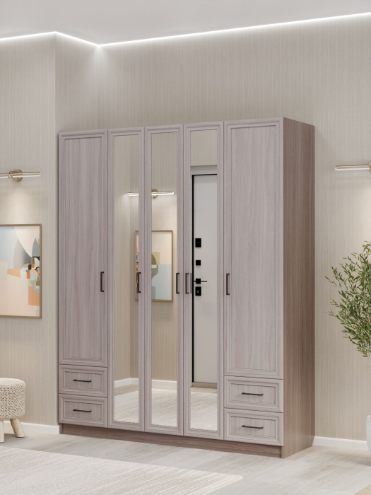 Шкаф распашной ШК‑5/7 — вместительное и функциональное решение для организации хранения в спальне, гостиной или прихожей. Пятидверный шкаф с двумя штангами, обширным набором полок и выдвижными ящиками позволяет максимально эффективно использовать пространство. Фасад из МДФ и корпус из ЛДСП гарантируют прочность конструкции, долговечность и эстетичный внешний вид. Нейтральный дизайн шкафа легко вписывается в современные интерьеры разных стилевых направлений.