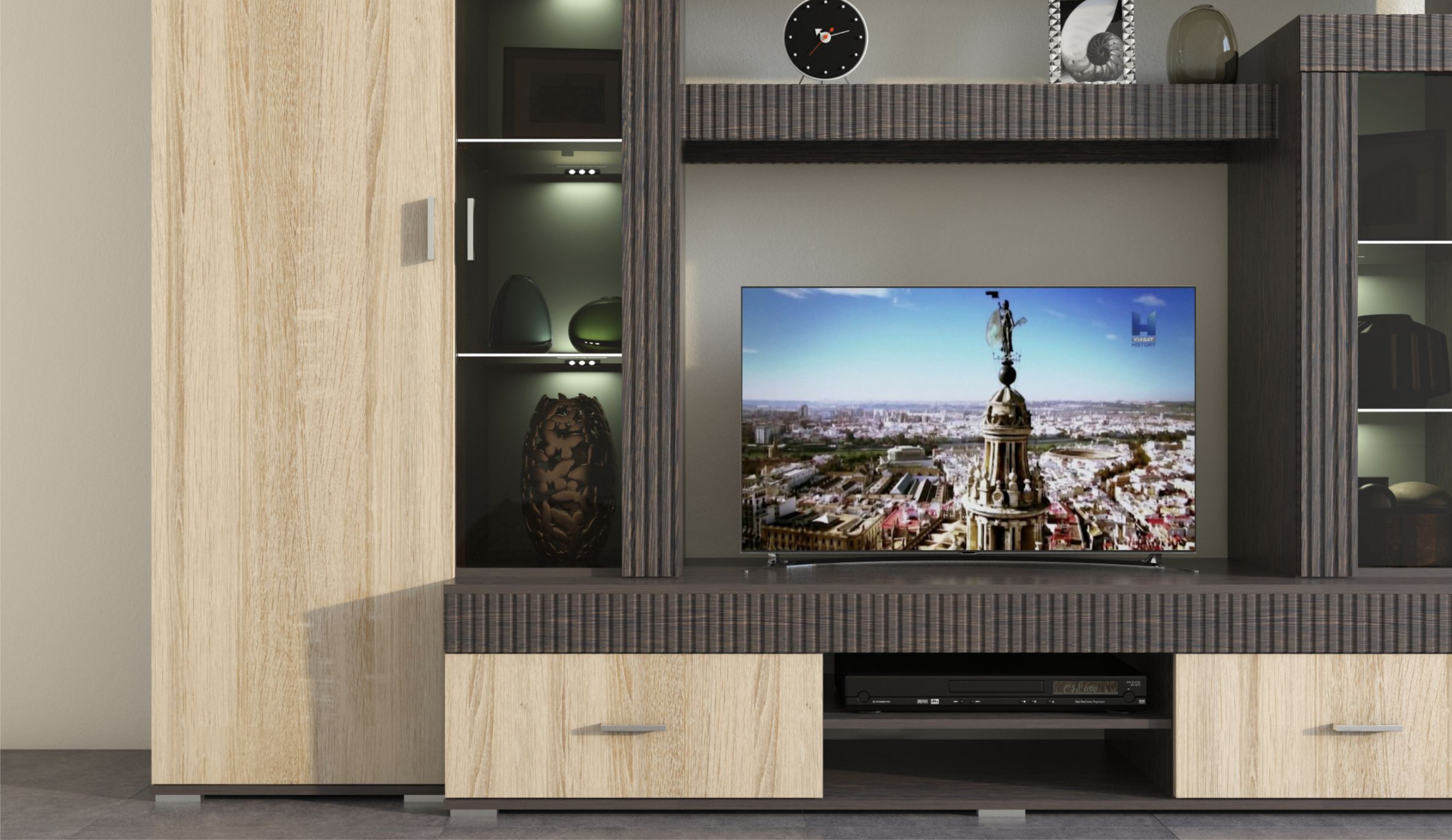 Марк - это готовое решение для гостиной и спальни в современном европейском стиле.Благодаря тщательно продуманной конструкции и правильному подбору цветов, позволяет создать уютную и теплую обстановку для отдыха и содержания дома в порядке.Отличительные особенности: утолщенные линии из рельефного МДФ, тонированные витрины со стеклянными полками, множество места для хранения при небольших размерах.
