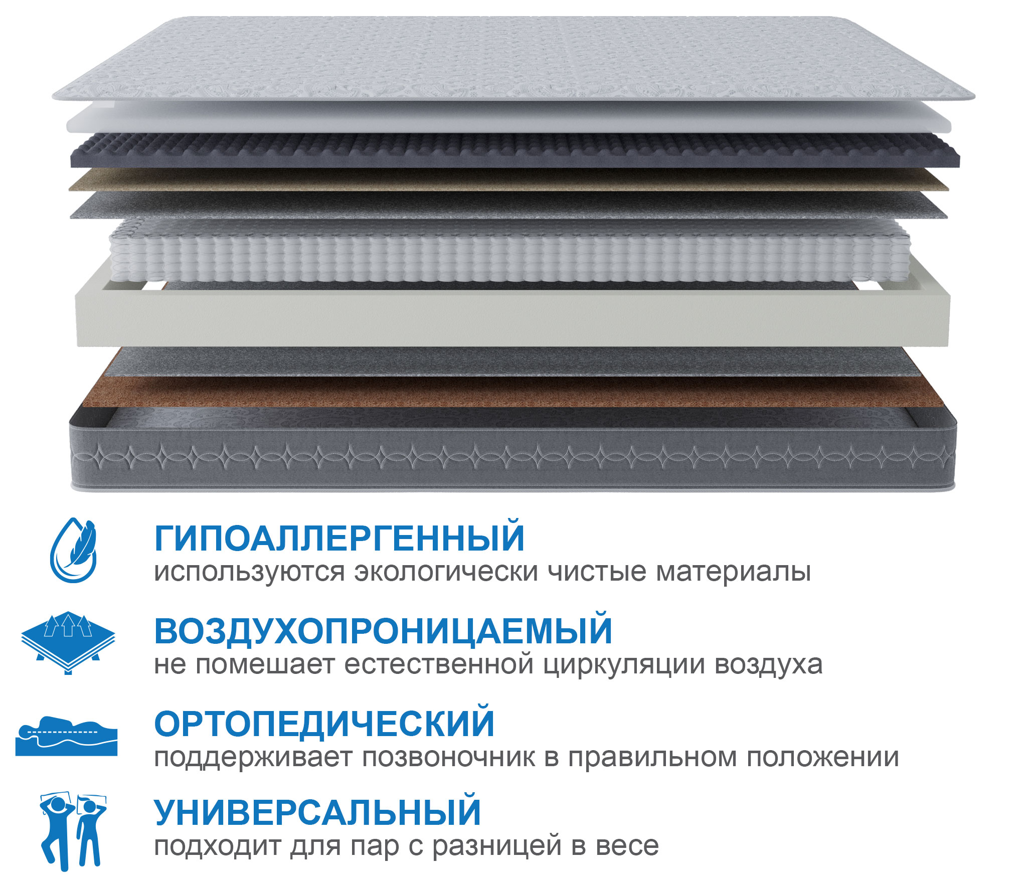 Наполнитель: вязкоэластичная пена с эффектом микромассажа, натуральный сизаль, латексированная кокосовая койра 20 мм, термовойлок