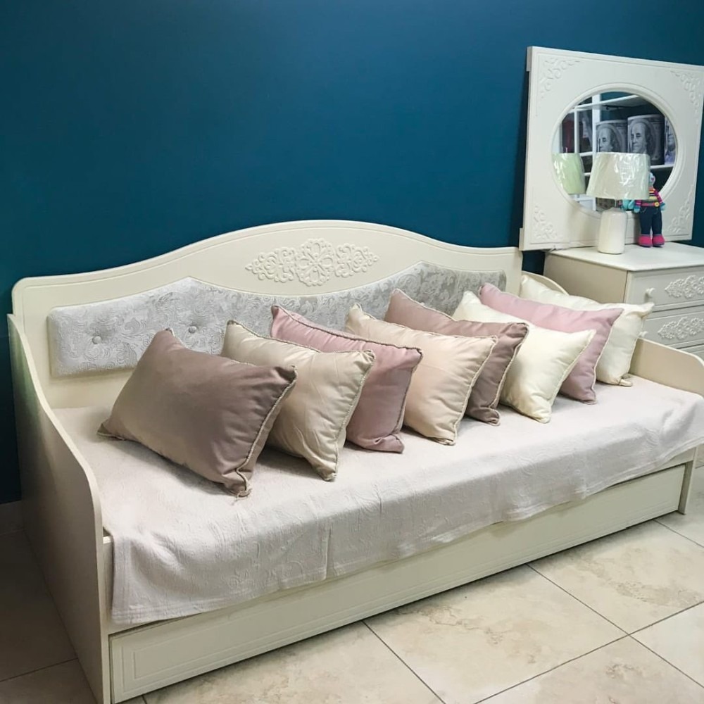 Кровать с мягкой спинкой, выдвижной ящик для белья. Основание кровати выполнено из ДСП. Мебель изготовлена из качественной ламинированной ДСП 16 мм. В оформлении фасадов МДФ применяется уникальная технология нанесения объемного узора (3-D). В цоколи встроены подпятники, предотвращающие повреждение пола.