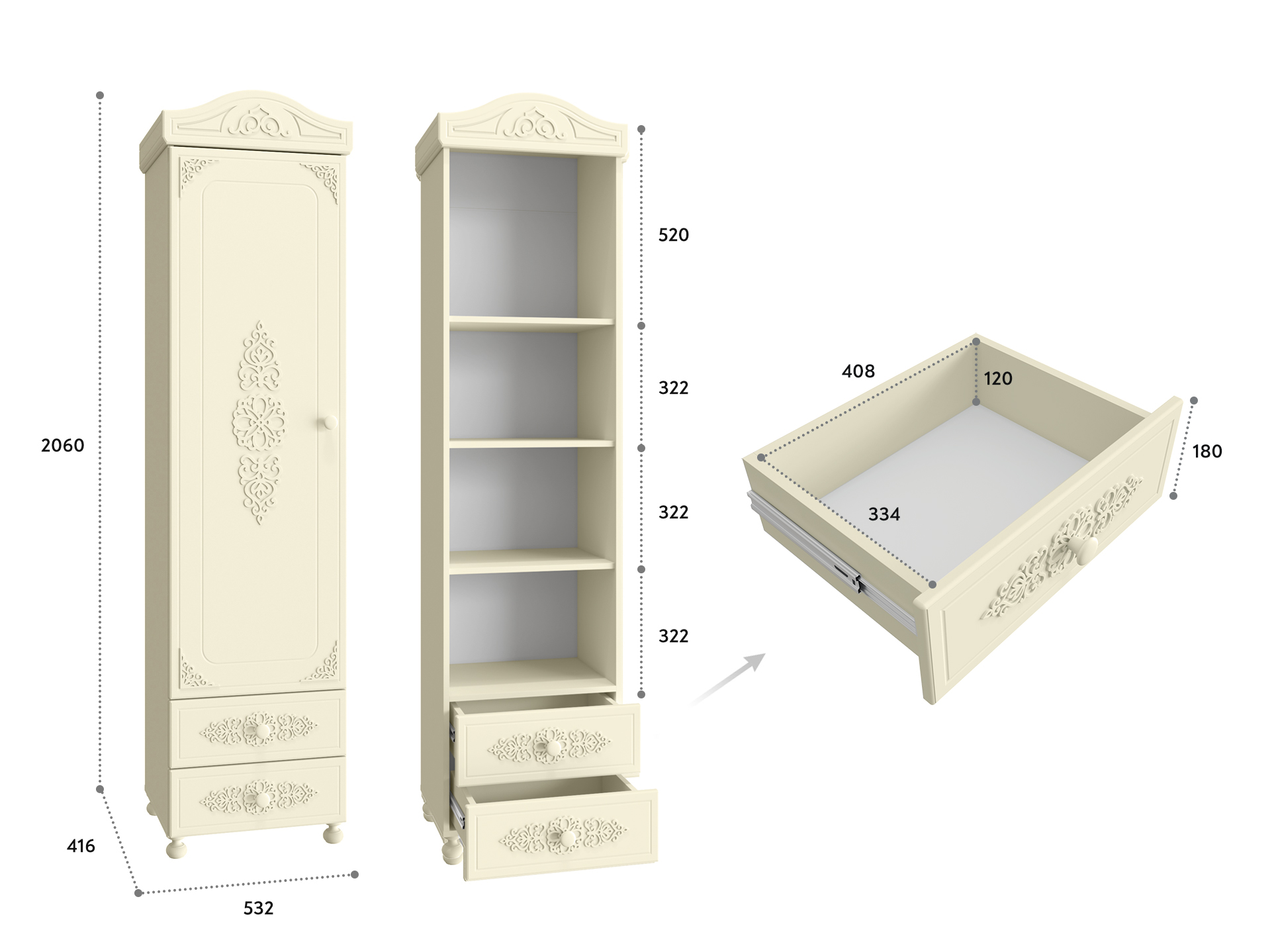 Шкаф-пенал с двумя выдвижными ящиками. Высота боковых стенок каждого ящика 130 мм, ширина ящика 408 мм, глубина 350 мм. Ящики установлены на телескопических направляющих полного выдвижения.