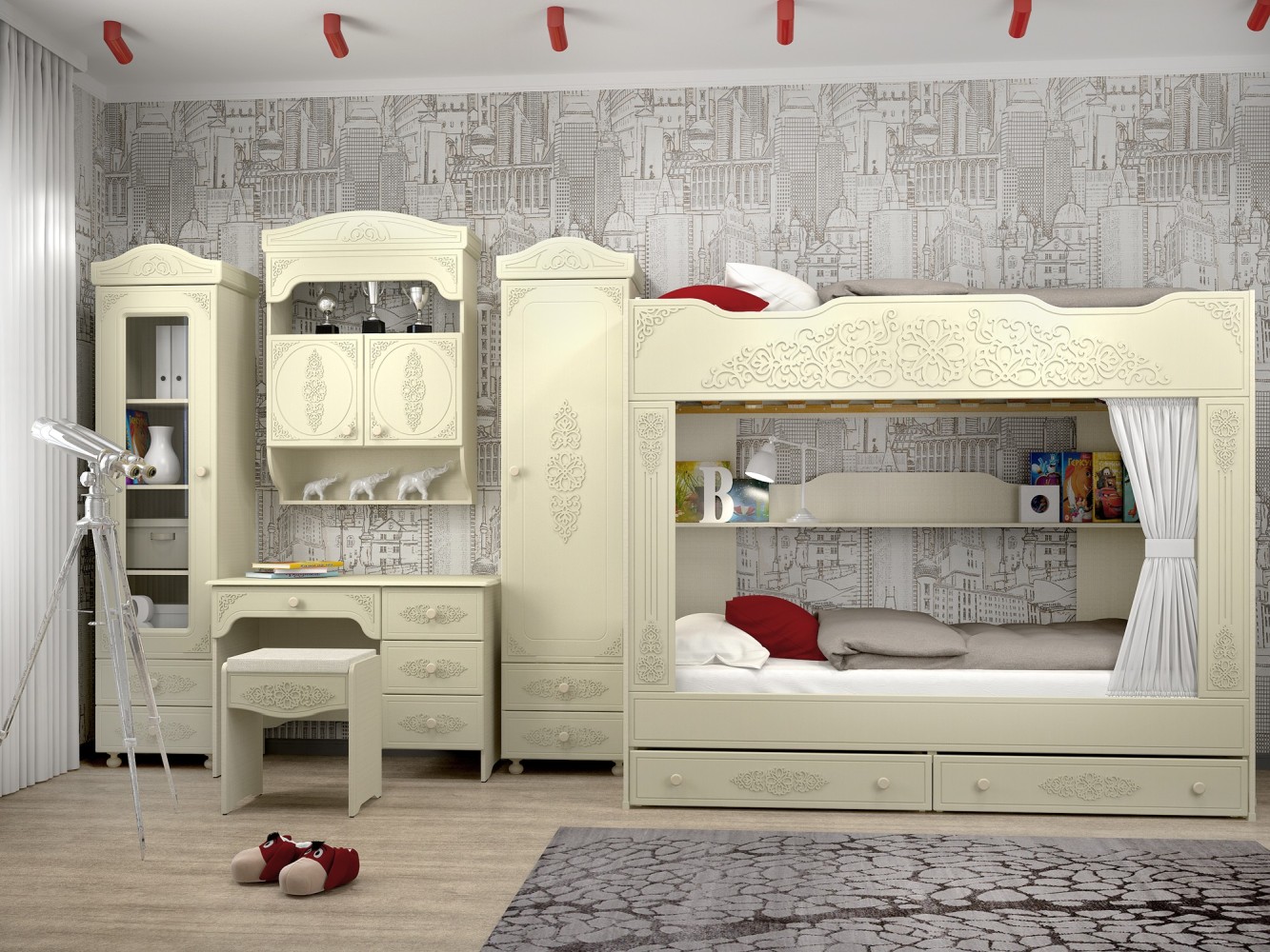 «Ассоль» - мягкий мерцающий глянец и эксклюзивный узор, повторяющийся на фасадах всех модулей идеален для создания нежного уютного интерьера спальни, гостиной, детской, прихожей.