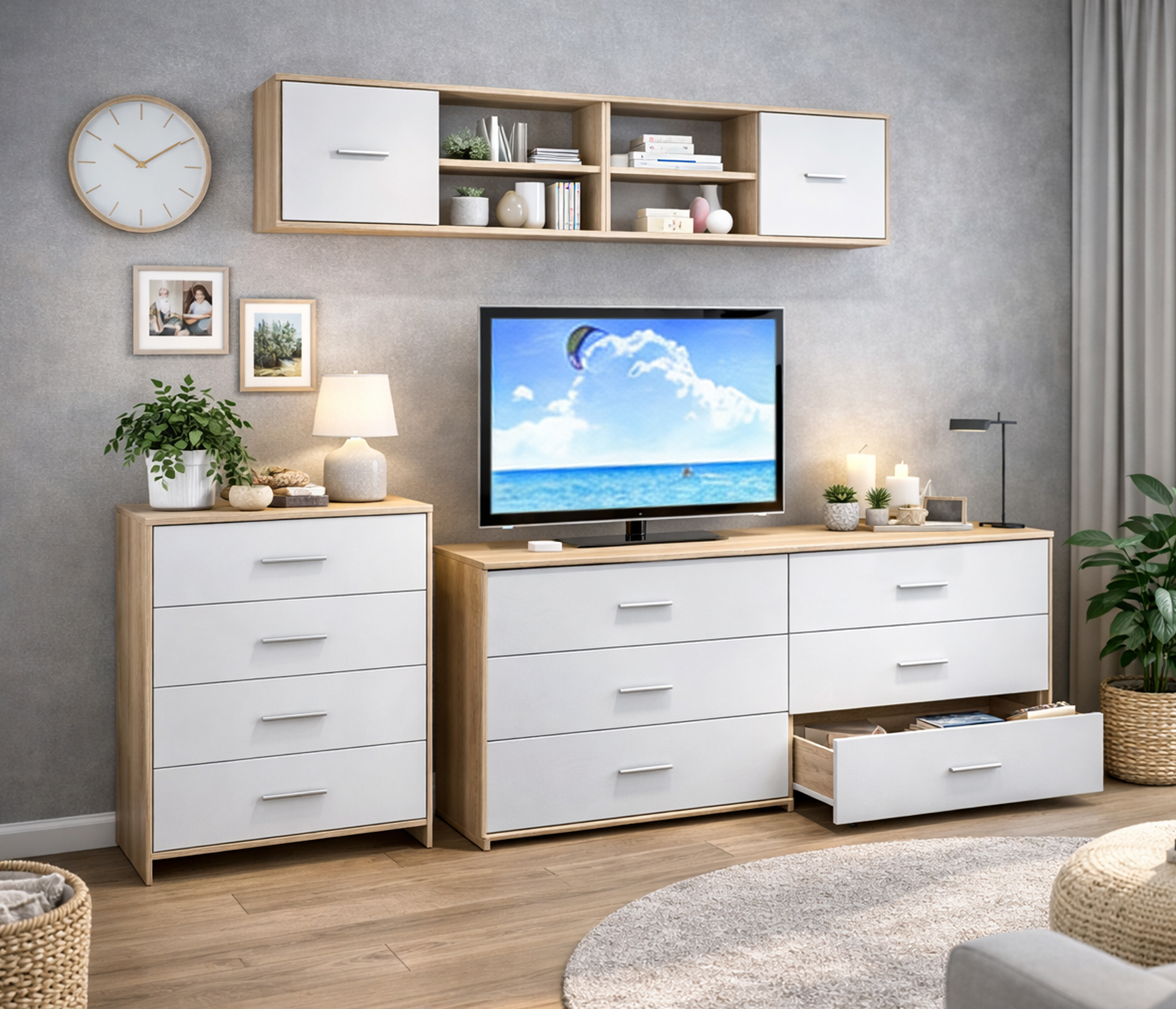 Габаритные размеры – ширина 103 см, высота 39 см и глубина 24 см. Полка состоит из двух открытых отделений, расположенных одно над другим и одного отделения за глухой дверцей.Выполнена полка из современного материала. .Полка крепится к стене при помощи дюбелей, которые входят в комплект.