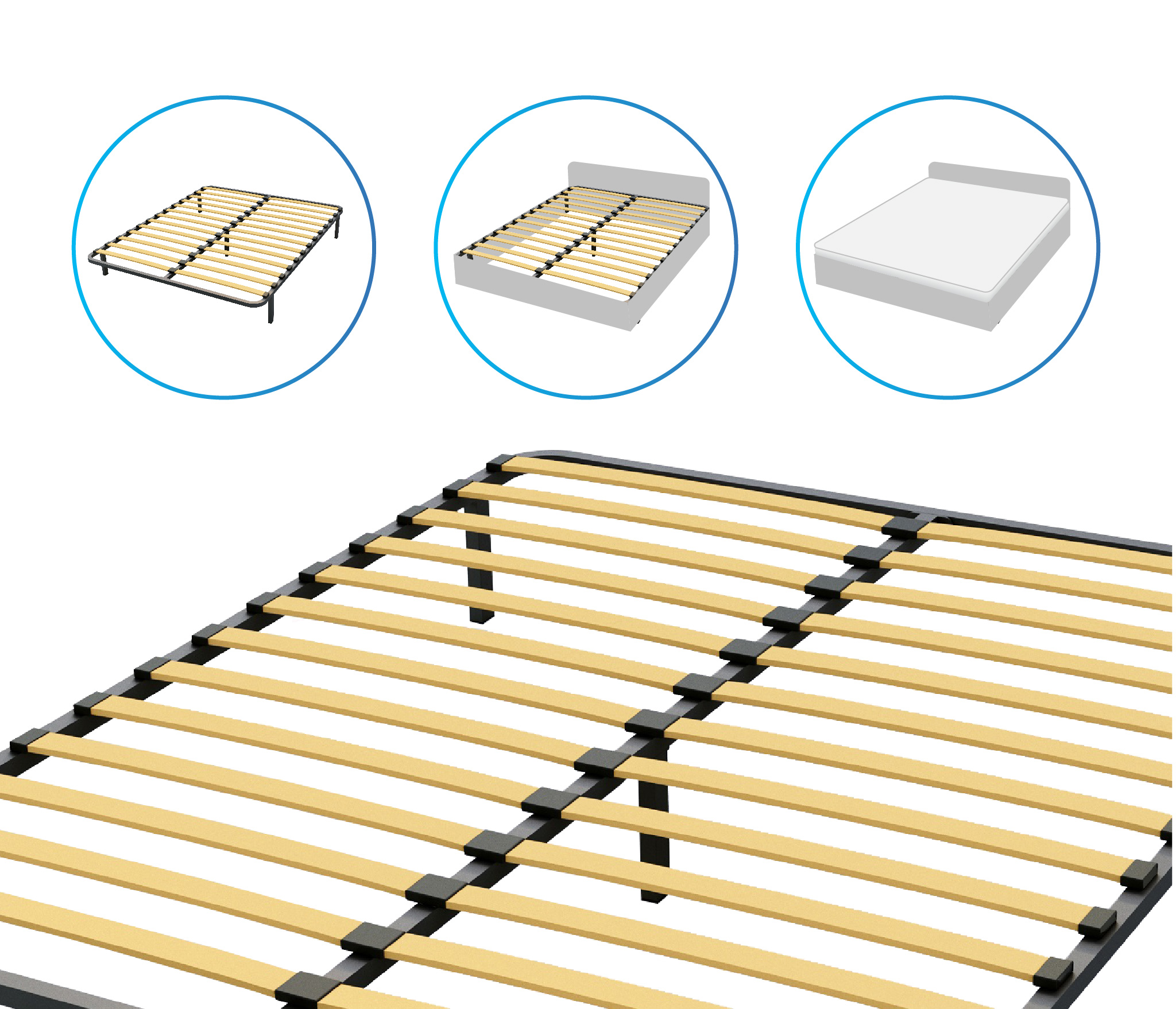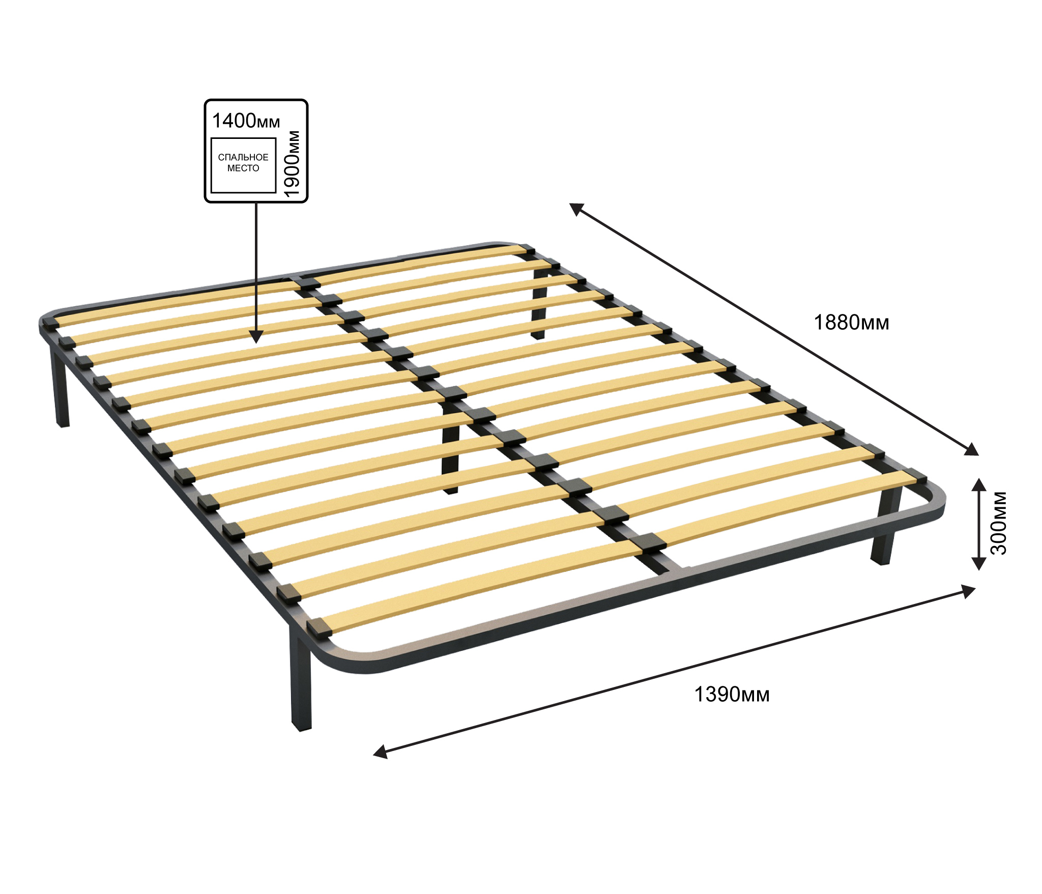 Разборное кроватное основание выполнено из металлической трубы квадратного сечения (30х30мм) и упругих гнуто-клееных берёзовых ламелей шириной 53 мм, толщиной 8 мм.