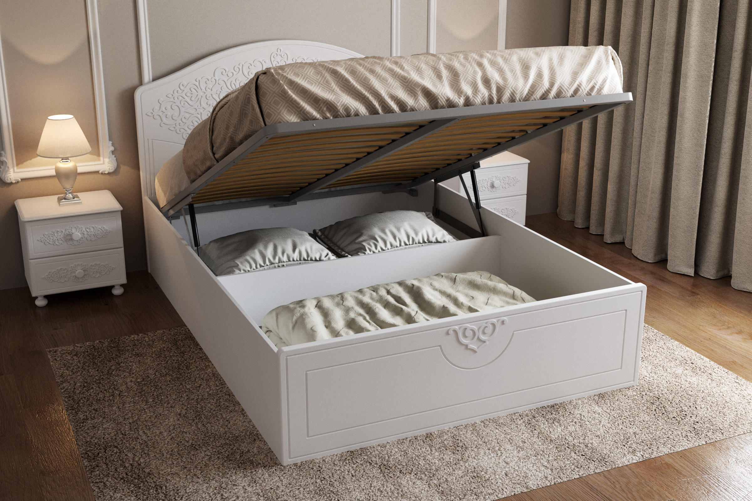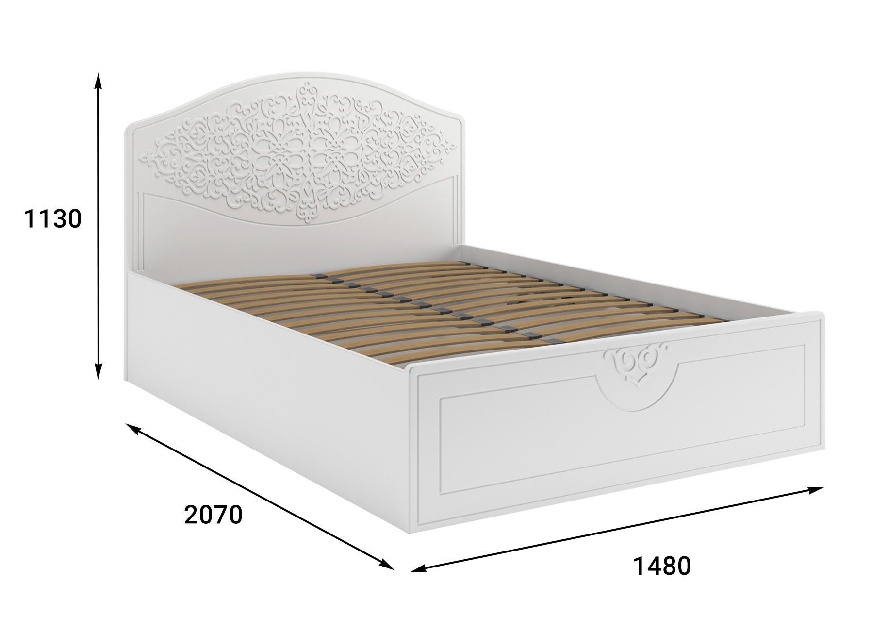 Материал корпуса/фасада: ЛДСП/МДФ. Цвет корпуса/фасада: белый структурный/белое дерево. Размеры модуля (д/ш/в) в мм: 2070х1479х1134. Высота изножья 420 мм. Основание кровати: ламели с подъемным механизмом. Особенности: короб для хранения постельного белья. Рекомендуемый размер матраса в мм: 1400х2000х200-230.