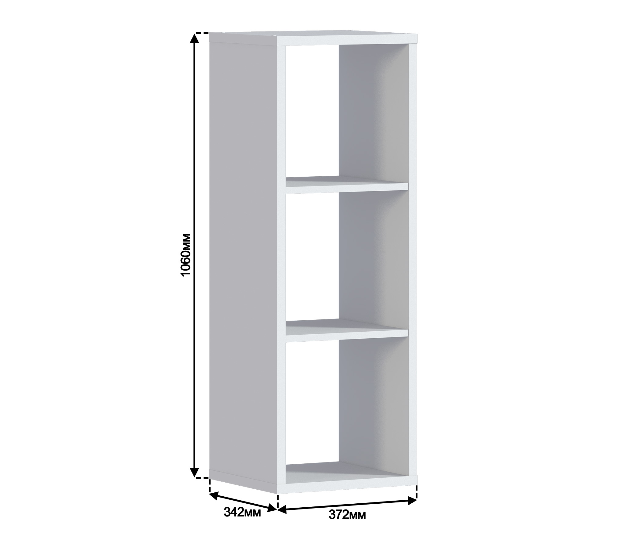 Габаритные размеры – ширина 37 см, высота 105 см и глубина 34 см. Конструктивно стеллаж представляет собой три открытые полки.