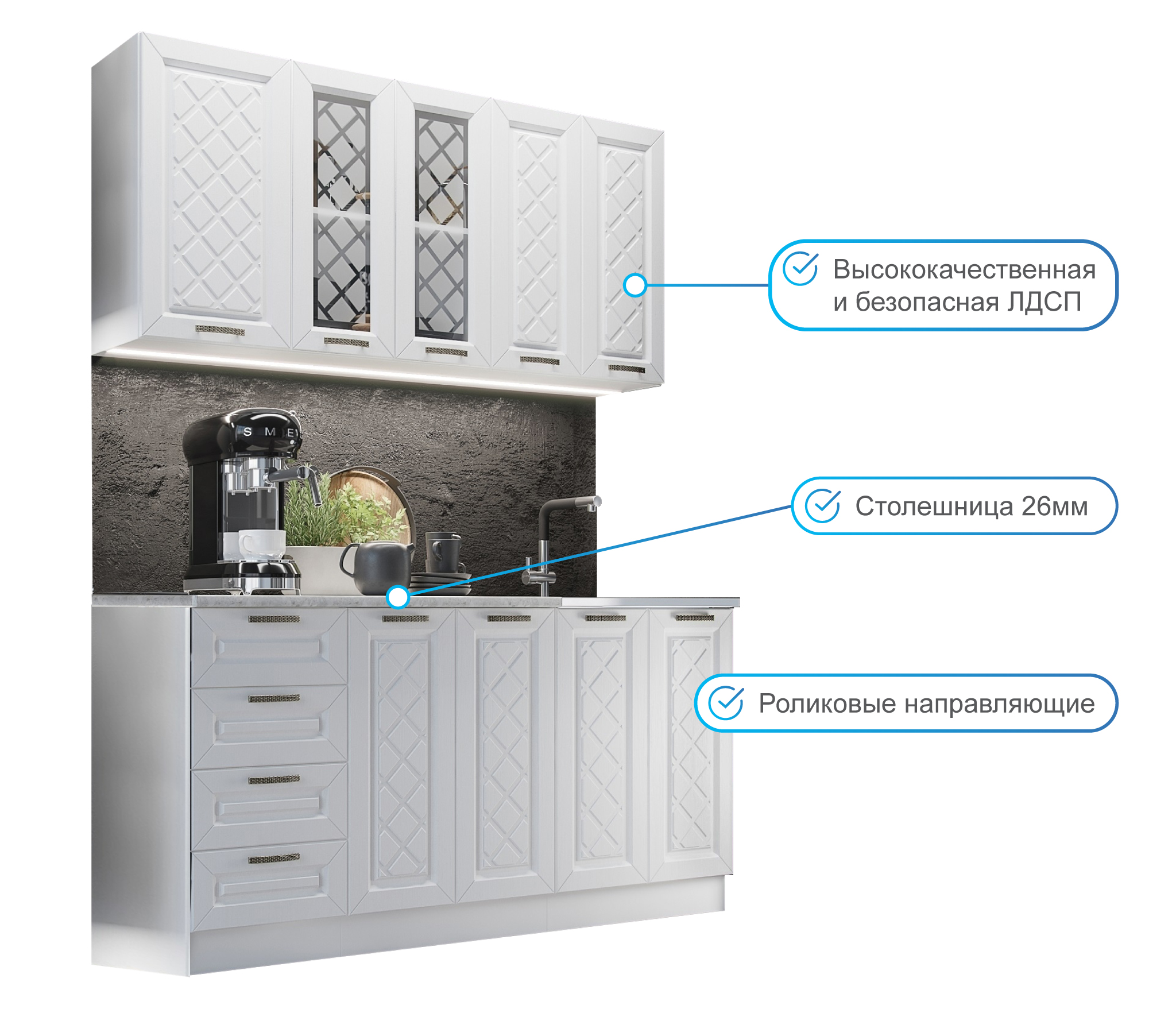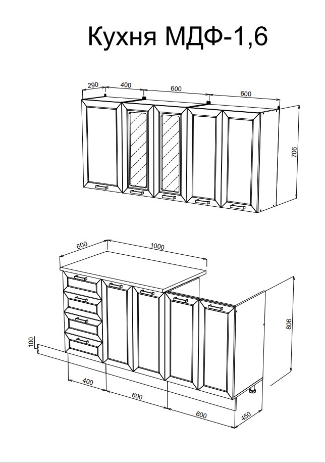 Глубина верхних и нижних шкафов указана с учетом фасада.