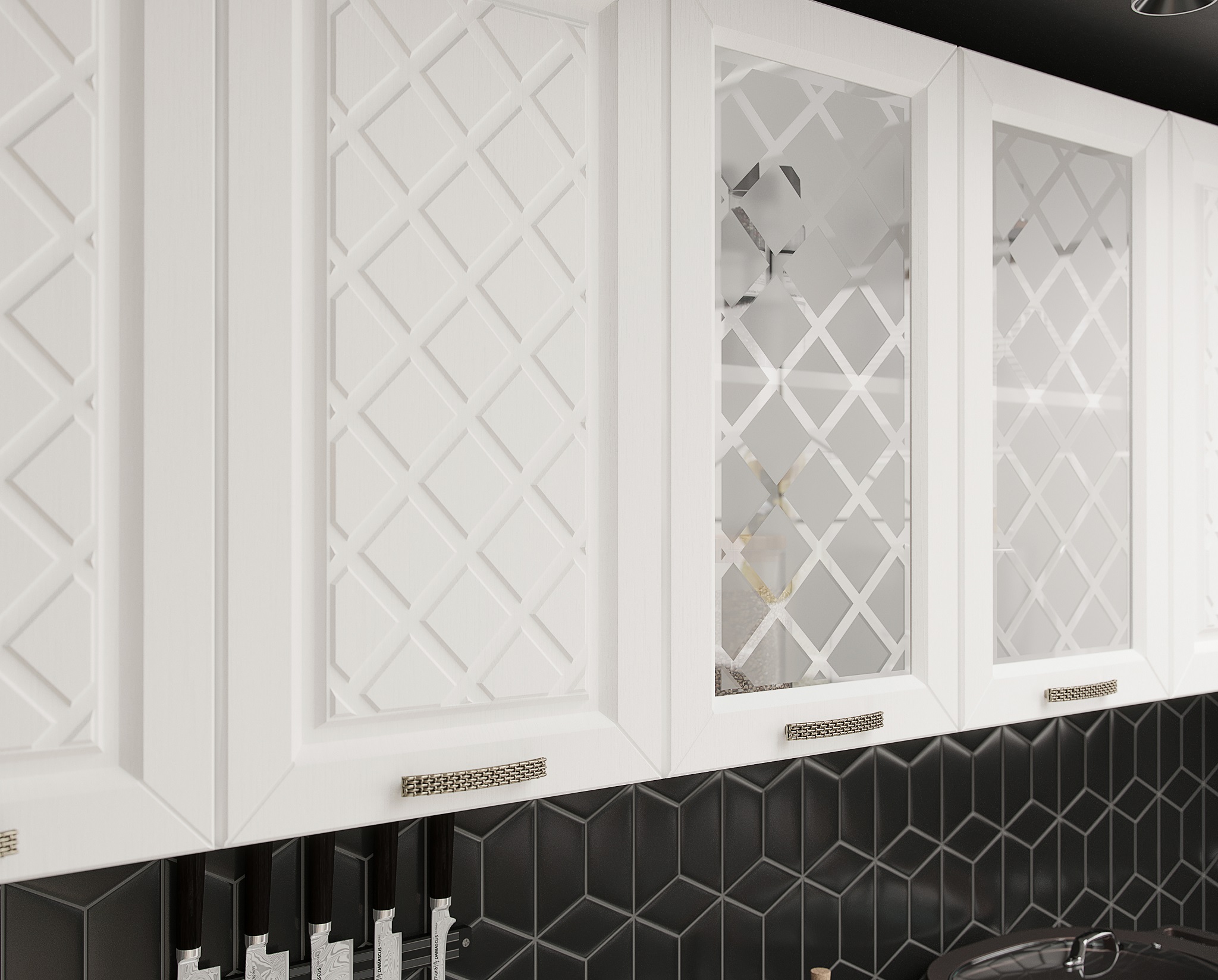 Кухня Агава- изящный гарнитур с фрезеровкой по фасаду и матовыми стёклами.