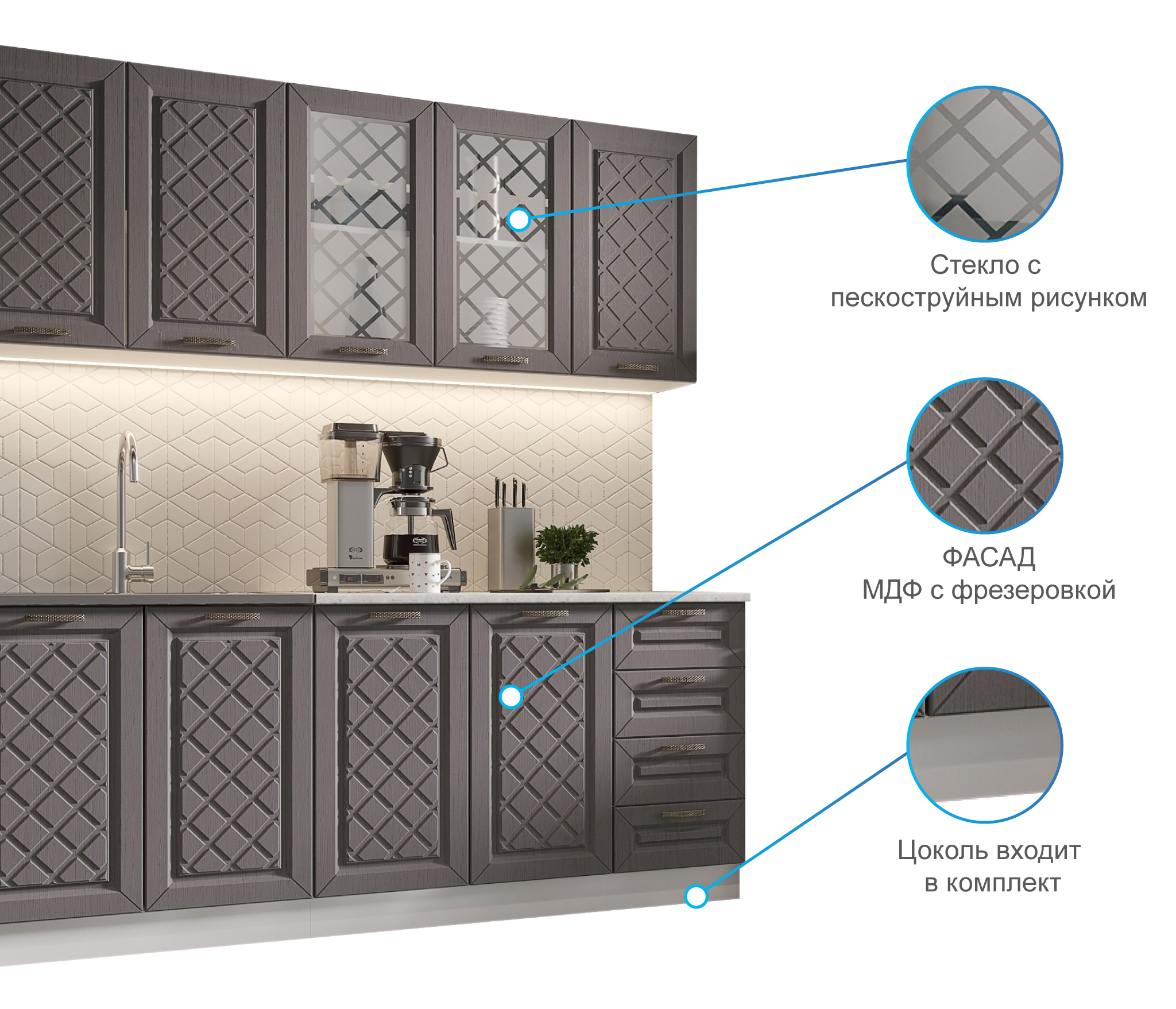 Кухня Агава- изящный гарнитур с фрезеровкой по фасаду и матовыми стёклами.