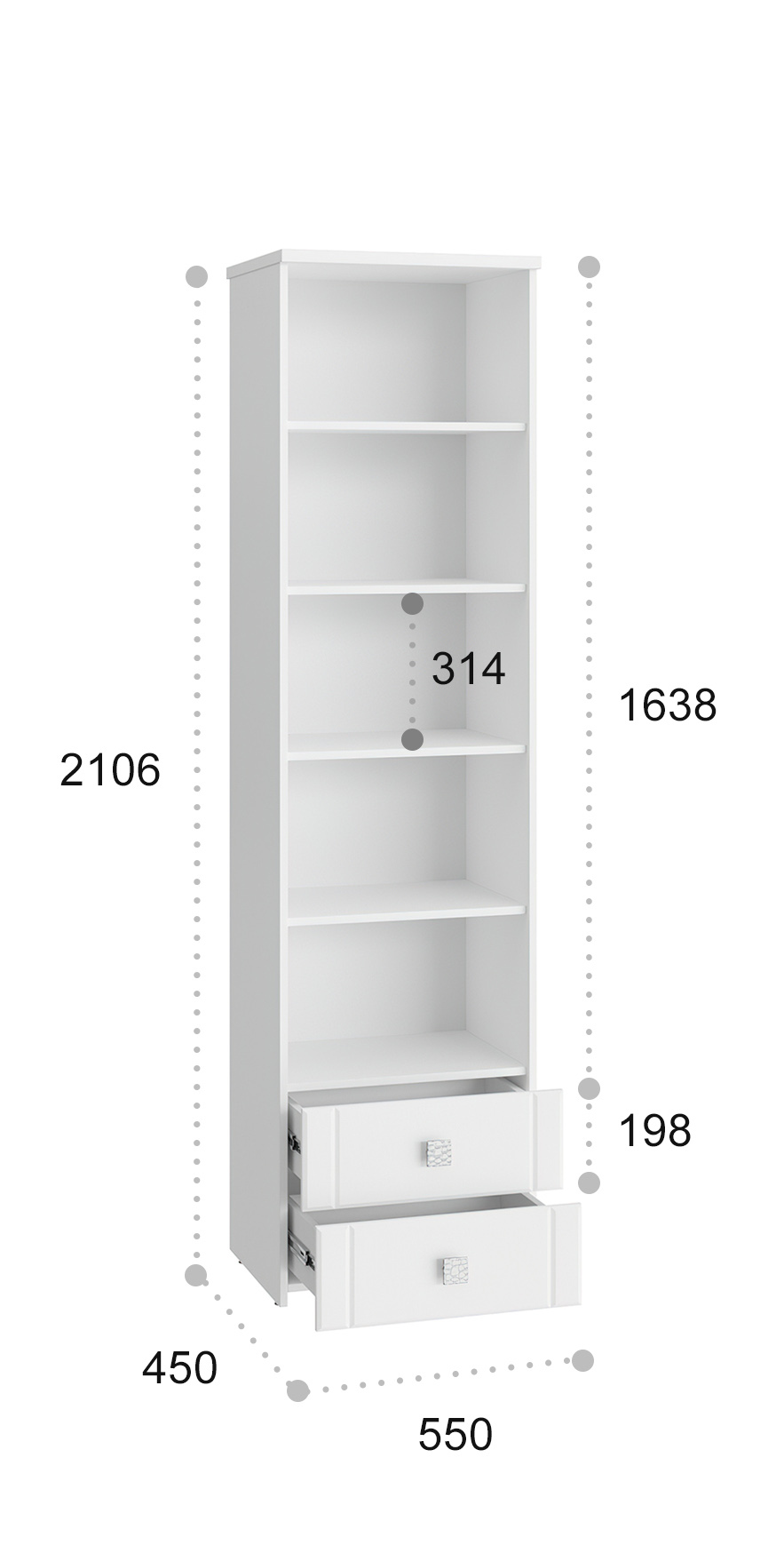 Размеры модуля (ш/в/г) вмм: 550х2106х450. Материал корпуса/фасада: ЛДСП, МДФ.