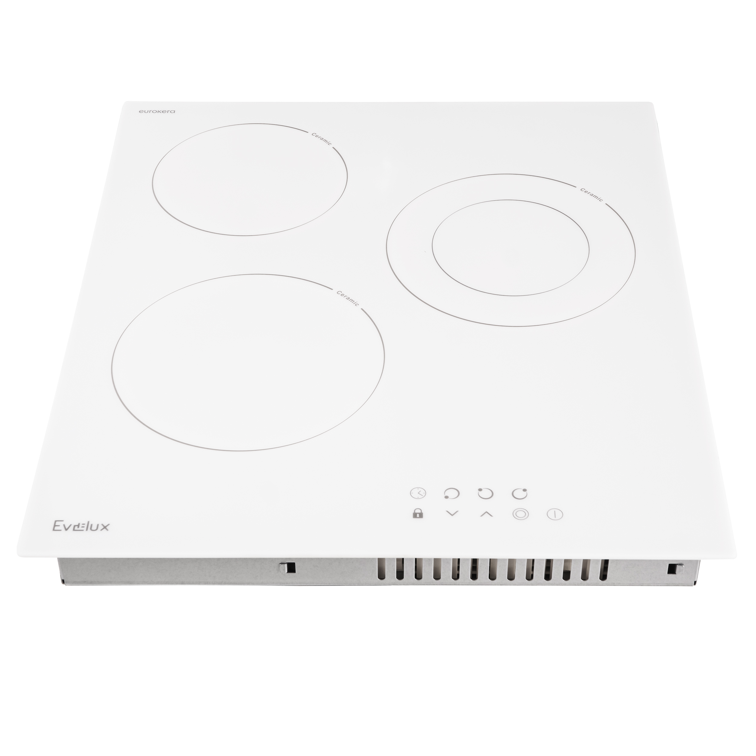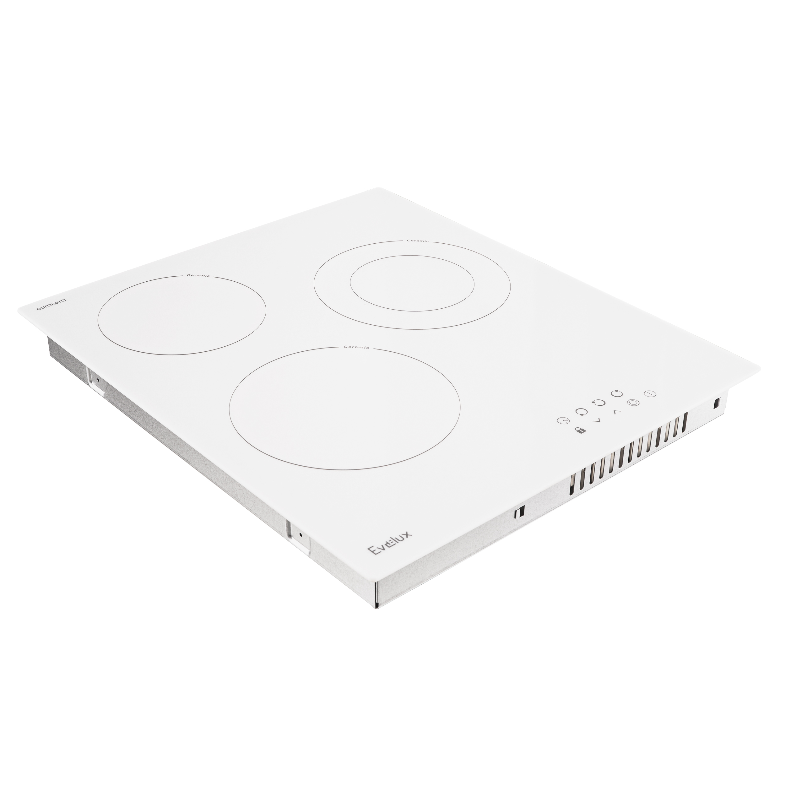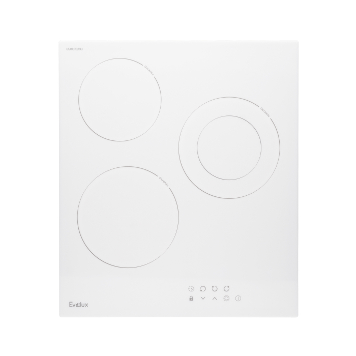 Варочная панель электрическая, стеклокерамика, Hi Light, 45 см, 3 конфорки, сенсорное управление, 9 уровней мощности, таймер 1-99 мин, блокировка управления, защитное отключение, двухконтурная, 5000 Вт, белое стекло Eurokera (Франция), 450х520х50 мм.