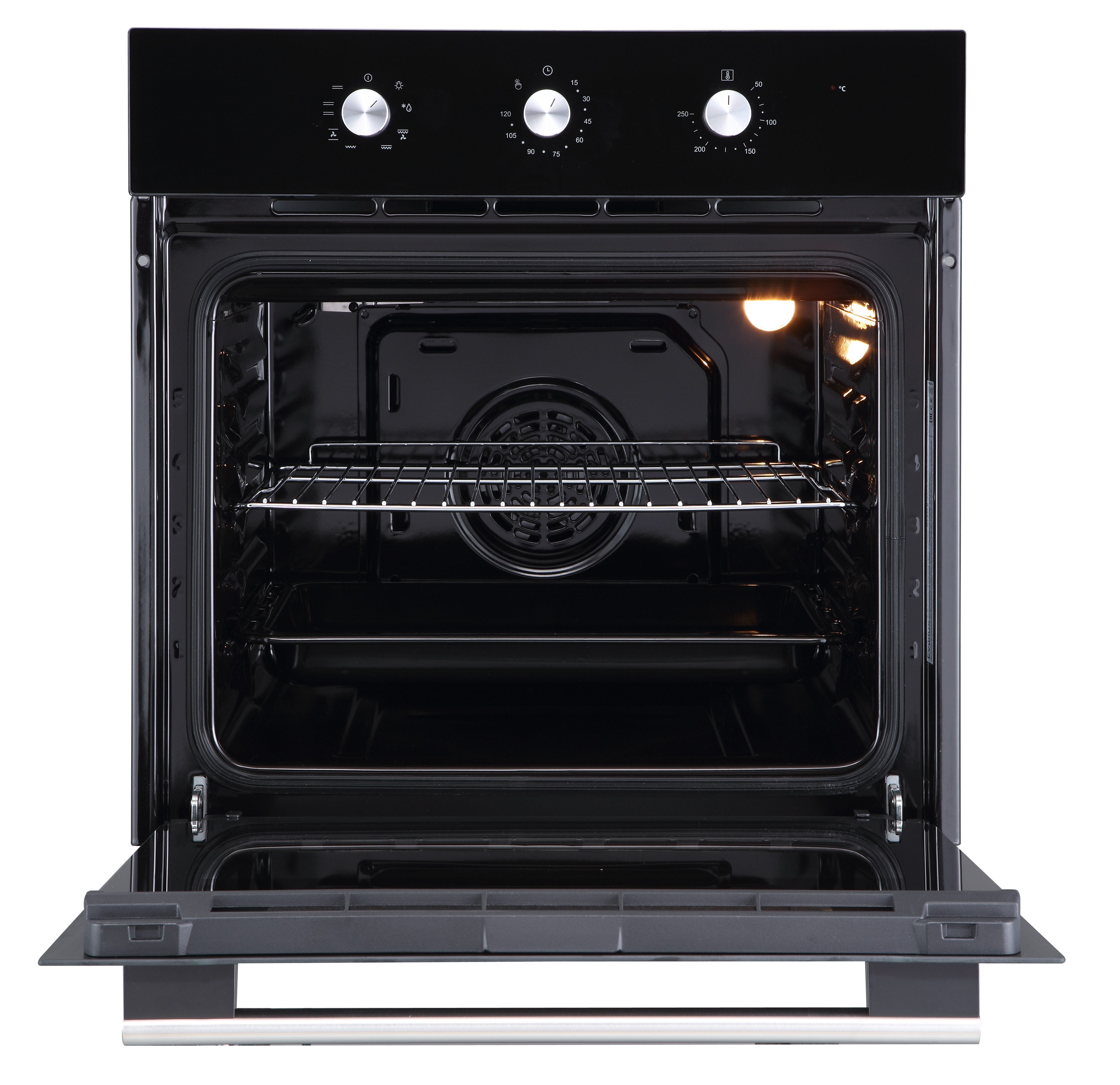 Электрический духовой шкаф встраиваемый полноразмерный, 60 см, 8 режимов, объем духовки 65л, поворотные переключатели, панель управления - черное стекло, универсальный противень, решетка-гриль, двойное стекло дверцы, легко-съемное большое внутреннее стекло Full Glass, защитное отключение, охлаждающий вентилятор, таймер 2 часа, 595х575х595 мм.