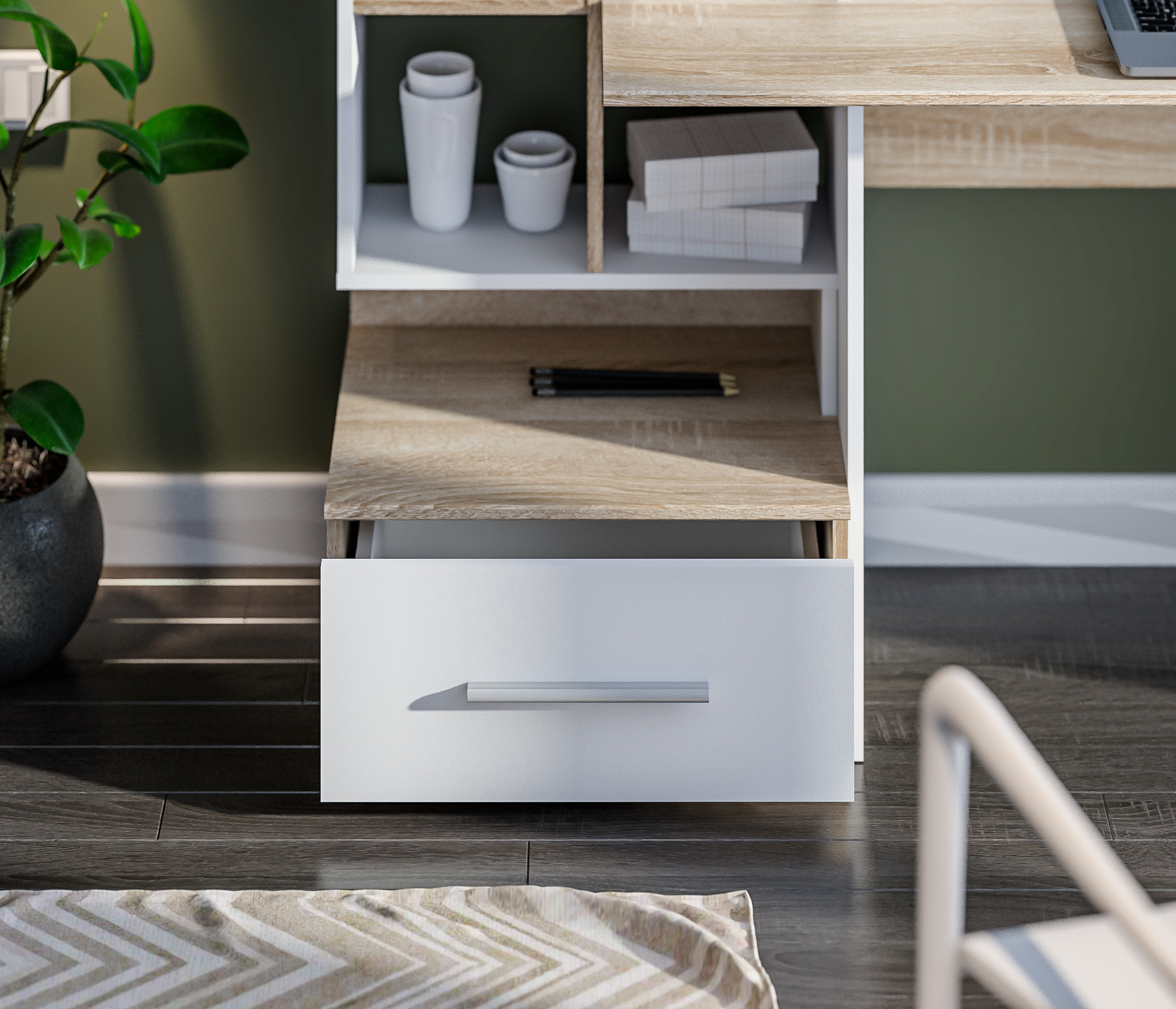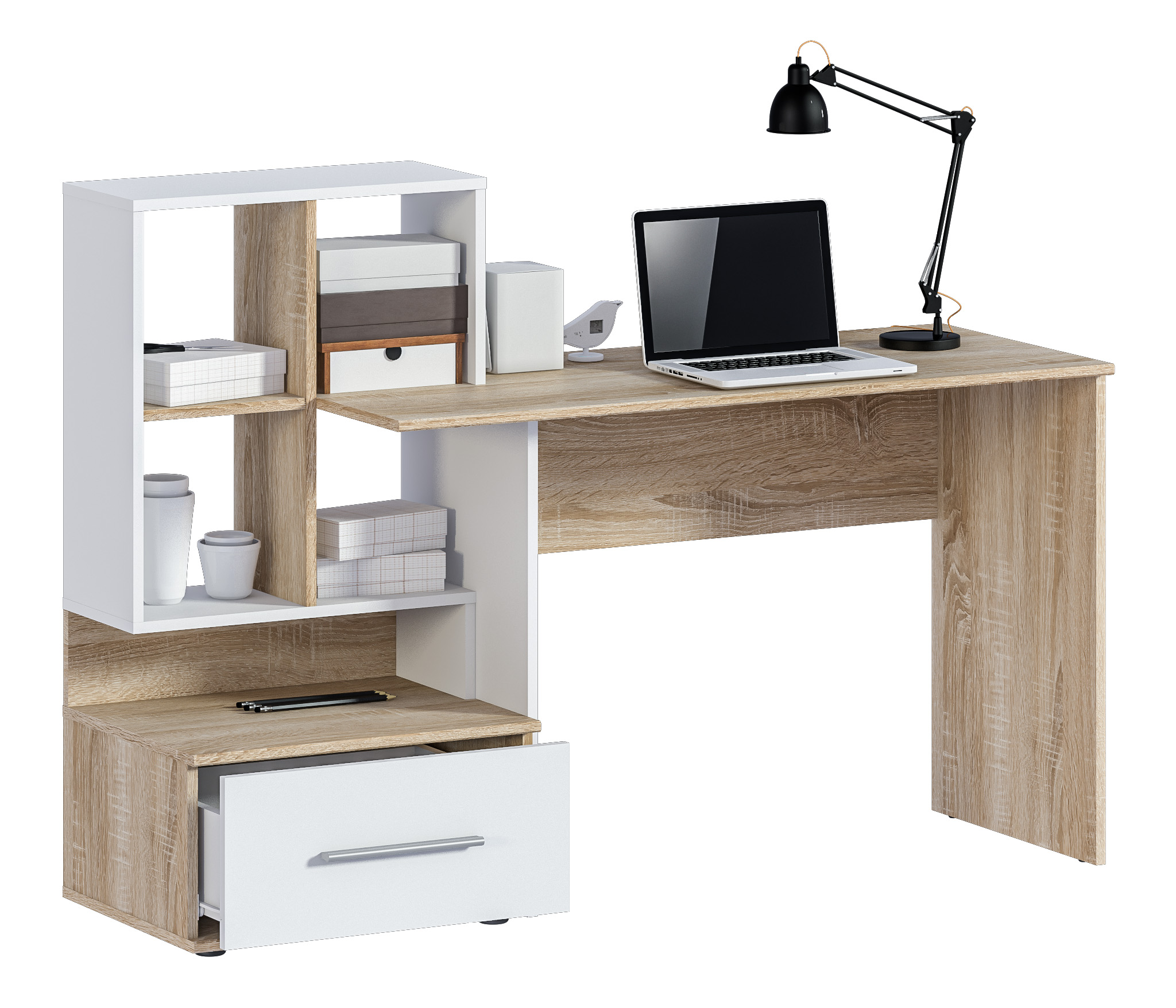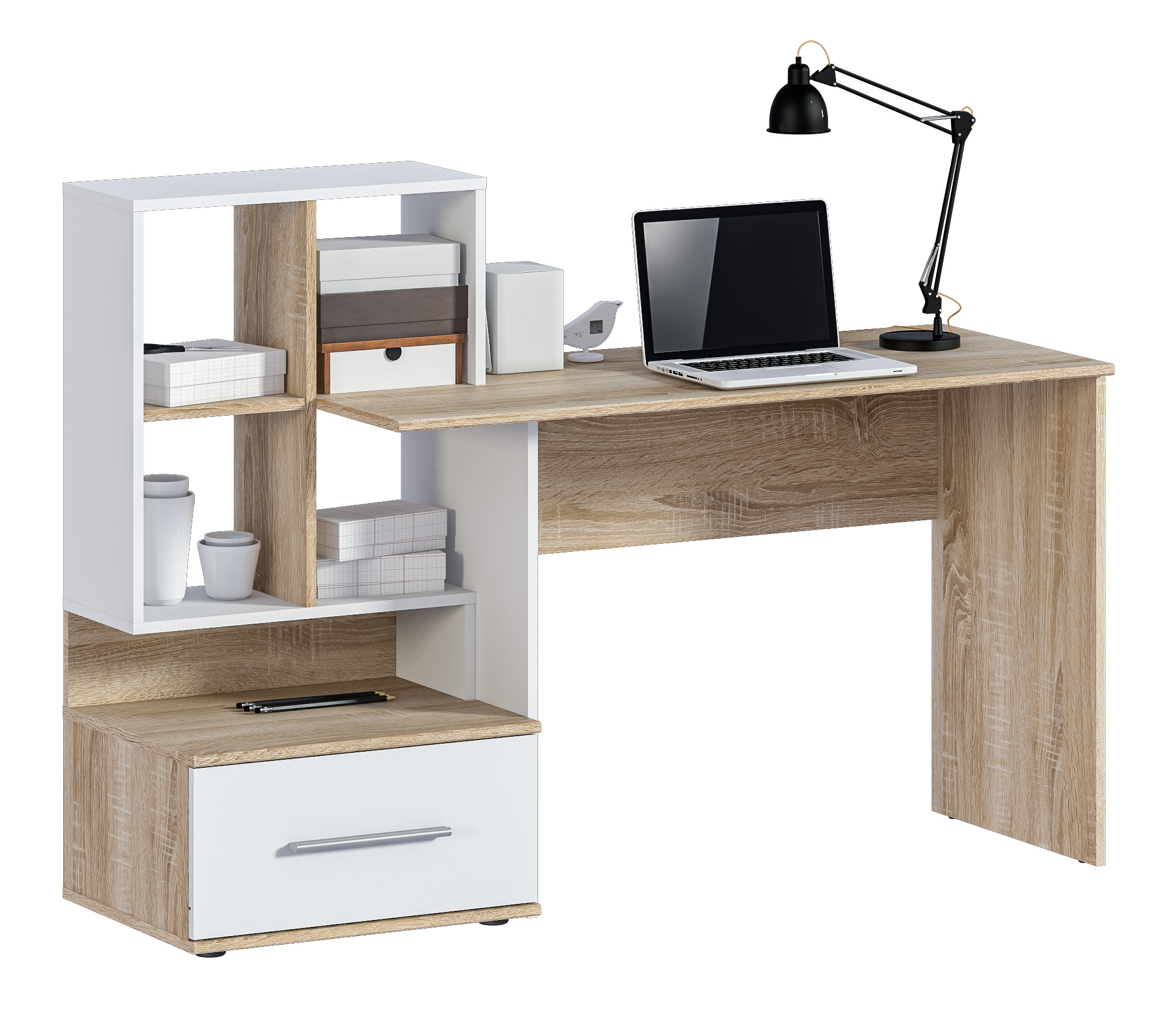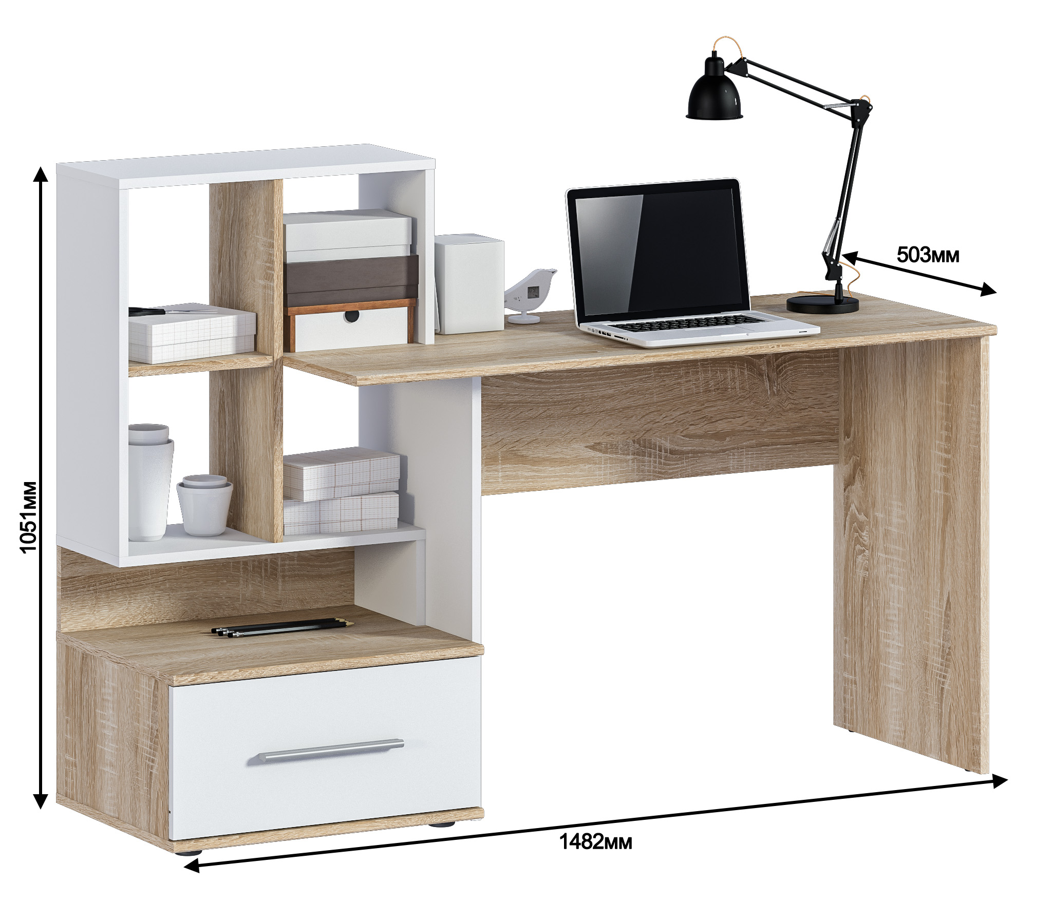 Стол Мамбо СБ-3339 – комфортное рабочее место, где предусмотрены отделения для хранения бумаг, книг, журналов. Он органично впишется в комнату школьника, студента, а также в кабинет. Габаритные размеры стола довольно просторные – ширина 148 см, высота 105 см и глубина 50 см. Рядом с рабочей поверхностью расположено вместительное отделение с полками и с ящиком.