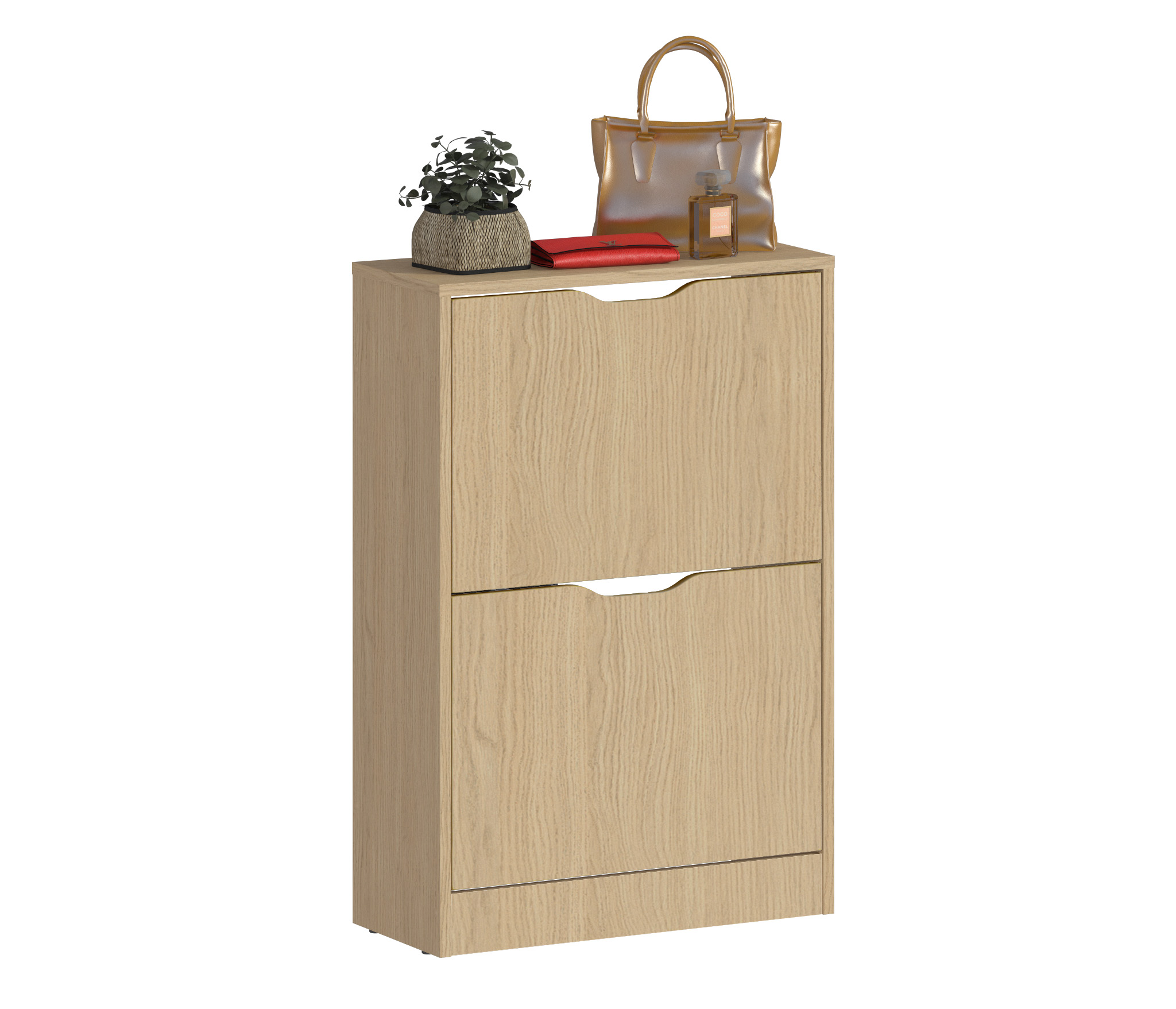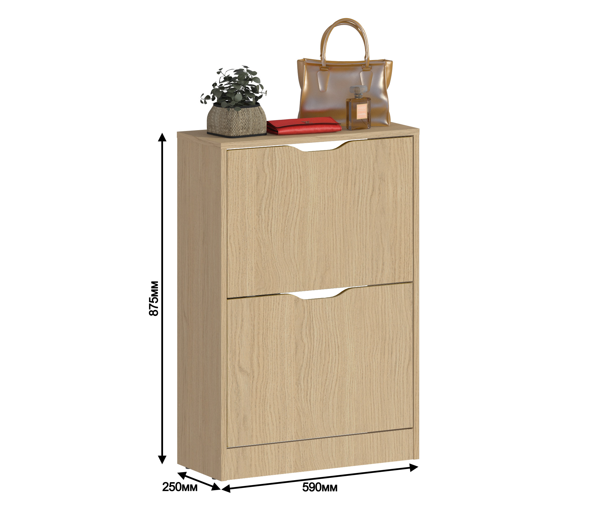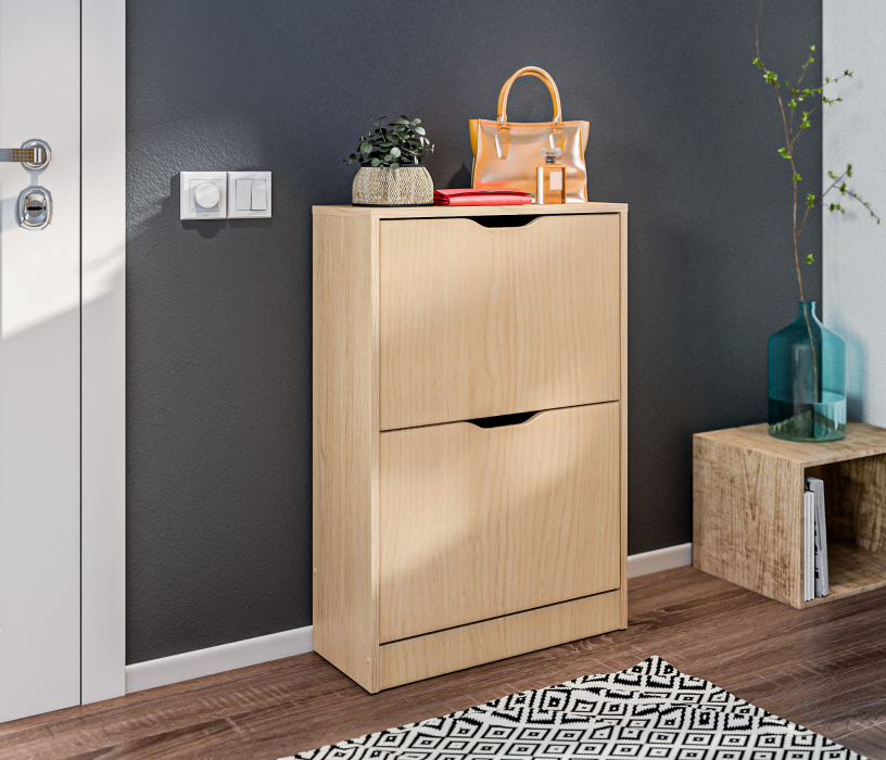Габаритные размеры – ширина 59 см, высота 87 см и глубина 25 см. Обувница имеет два отделения, каждое из которых оснащено специальными стойками для хранения обуви. Прорезные ручки и строгие геометрические формы позволяют вписать обувницу в любой интерьер. Обувница произведена из экологичного прочного КДСП, устойчивого к мелким механическим повреждениям.