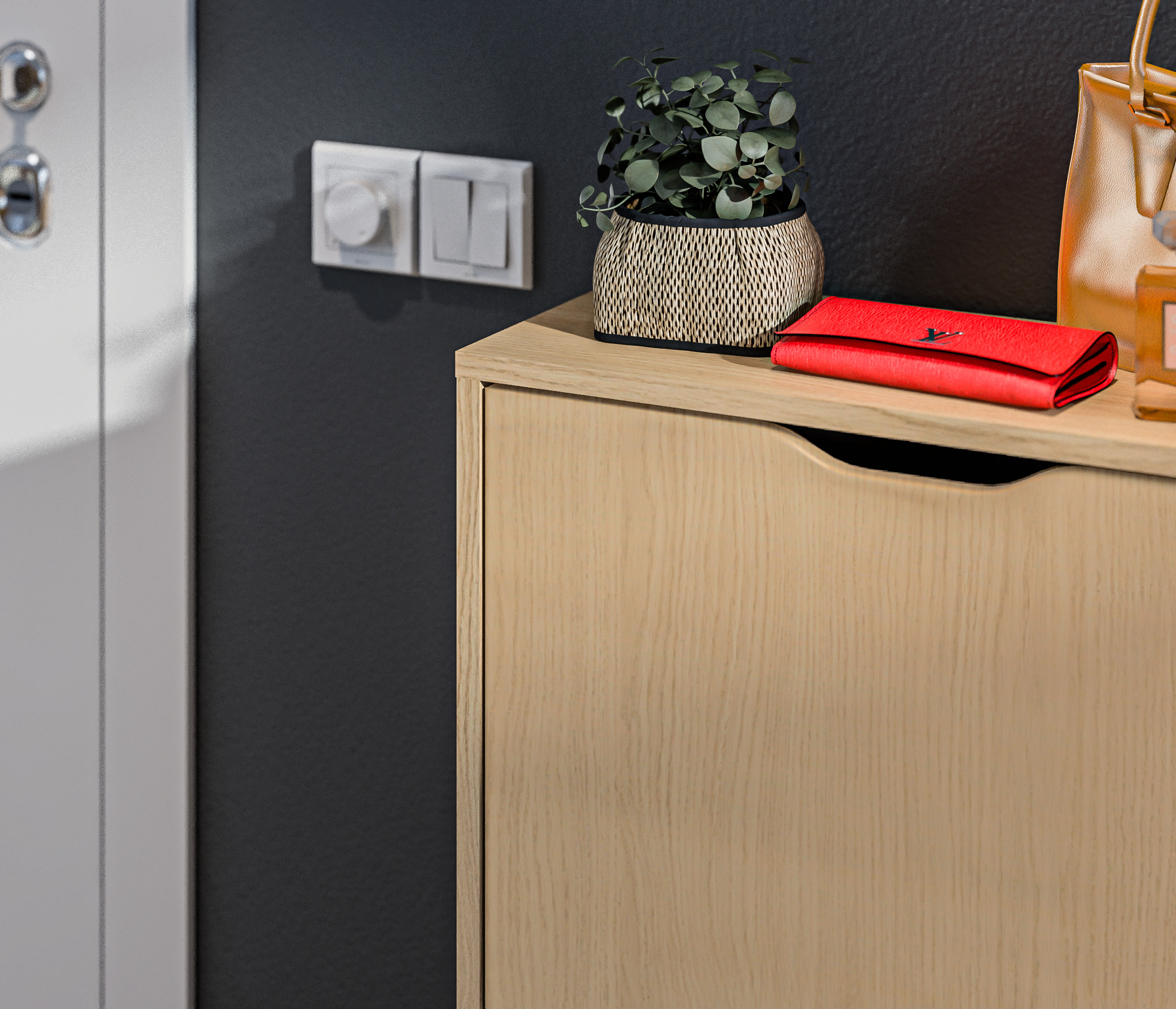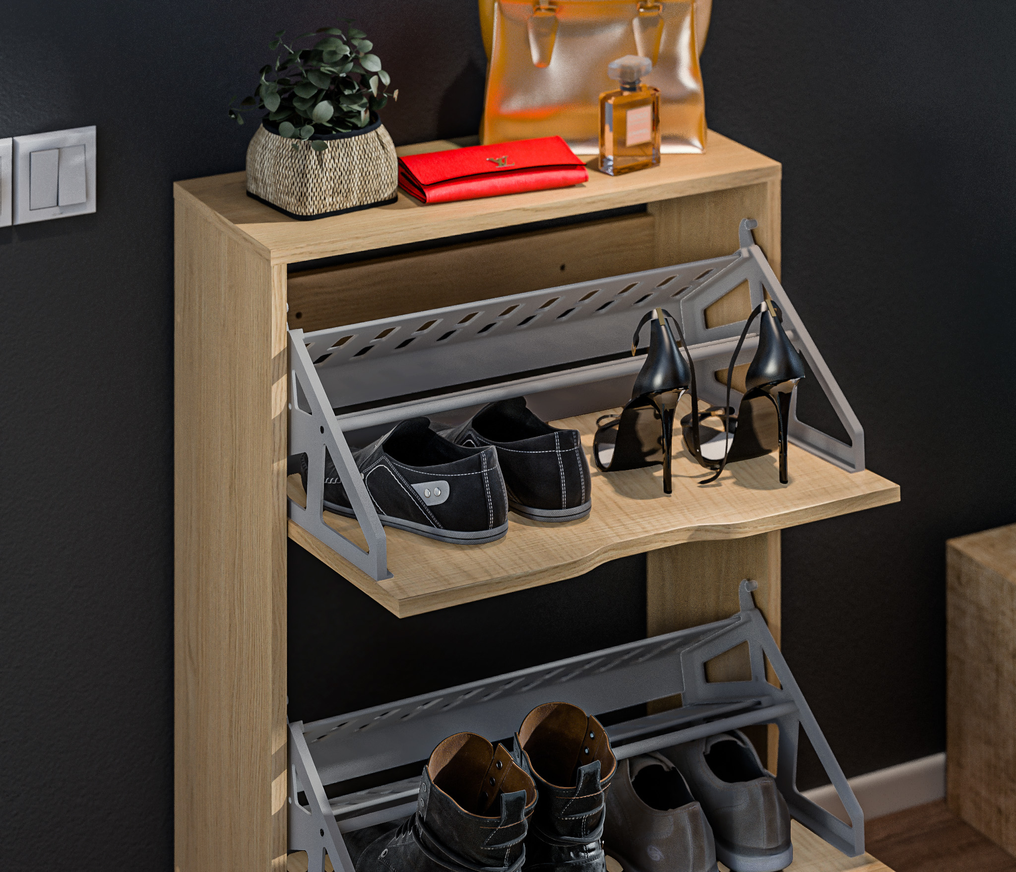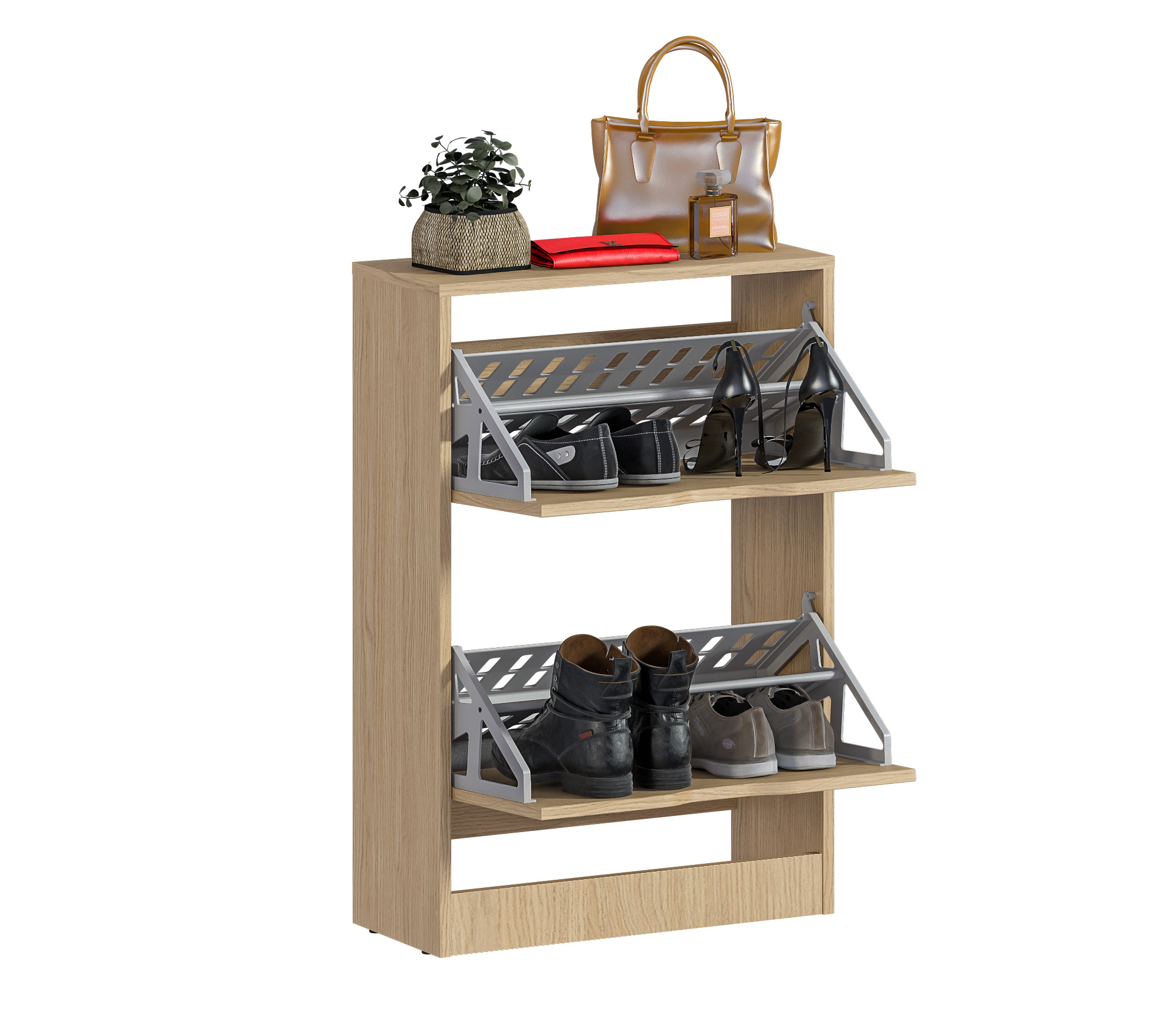 Габаритные размеры – ширина 59 см, высота 87 см и глубина 25 см. Обувница имеет два отделения, каждое из которых оснащено специальными стойками для хранения обуви. Прорезные ручки и строгие геометрические формы позволяют вписать обувницу в любой интерьер. Обувница произведена из экологичного прочного КДСП, устойчивого к мелким механическим повреждениям.