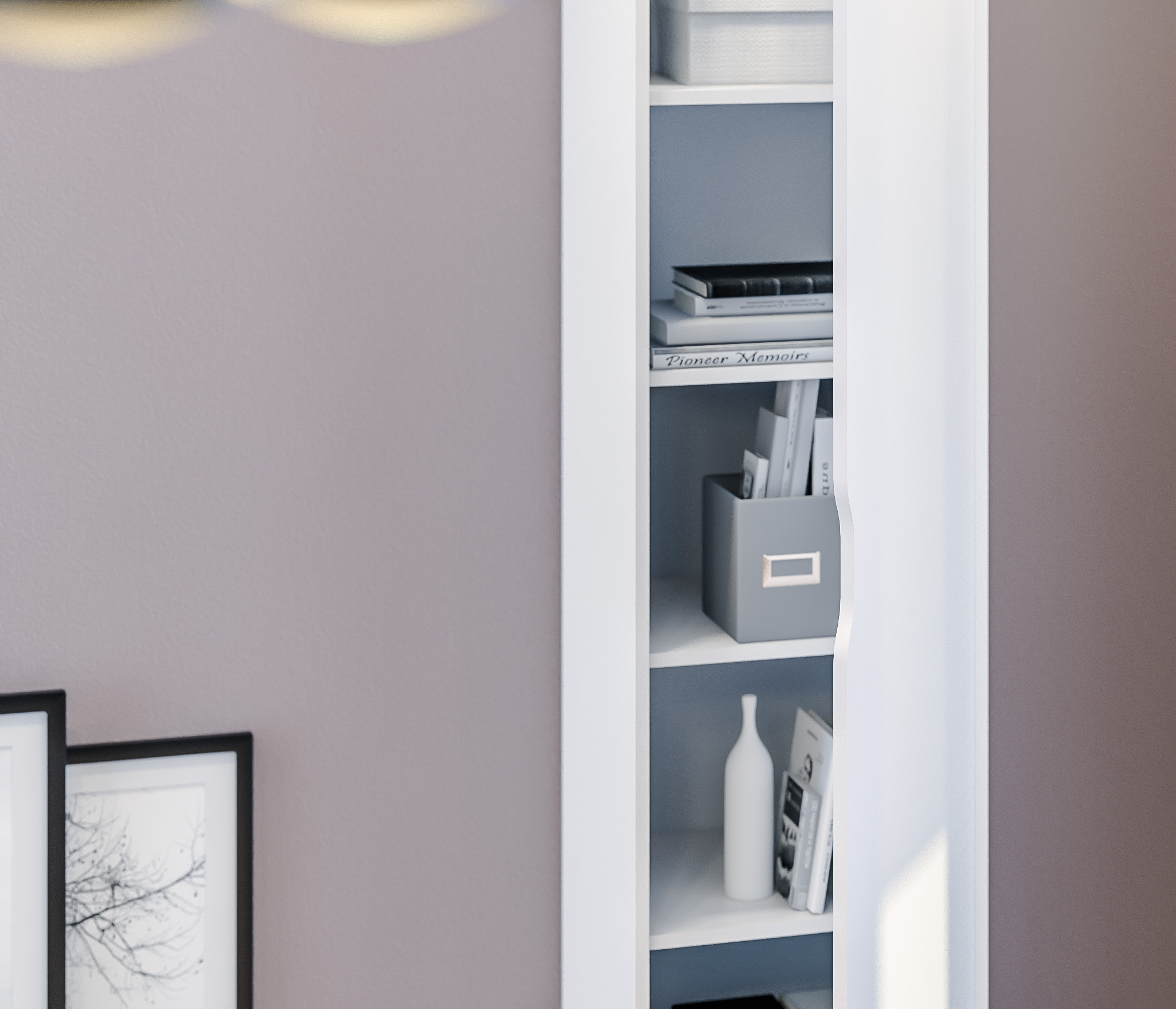 Корпус шкафа выполнен из прочного ламинированного ДСП, отделка в цвете «Белый альпийский». Материал фасадных поверхностей – ЛДСП в цветах отделки «Белый альпийский» и «Серый перламутровый». Вся мебель коллекции выполнена в лаконичном дизайне, без лишнего декора и безопасна в использовании.
