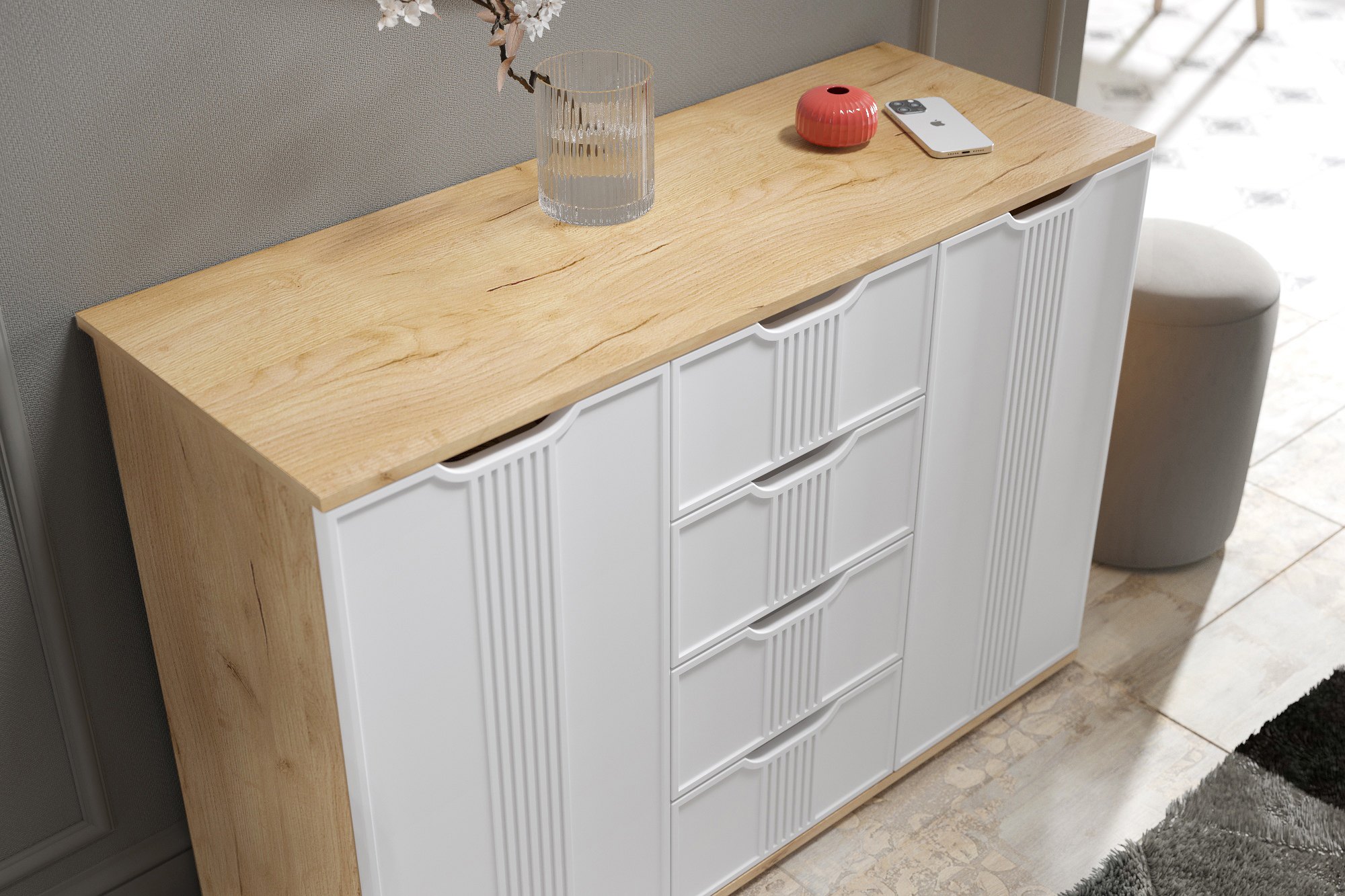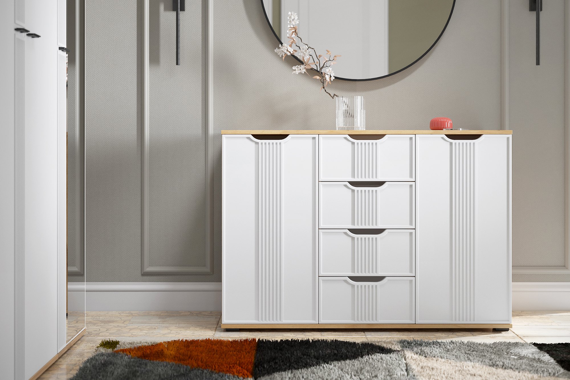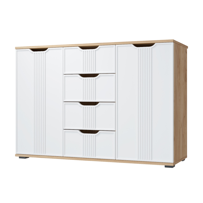 Комод Эмилия ЭЛ-21 изготовлен из ЛДСП 16 мм, фасады МДФ. Свес крышки в 30 мм обеспечит прилегание к стене с любым плинтусом. Фурнитура: телескопические направляющие полного выдвижения без доводчиков. Важная информация. Мебель доставляется в разобранном виде, в упаковках.