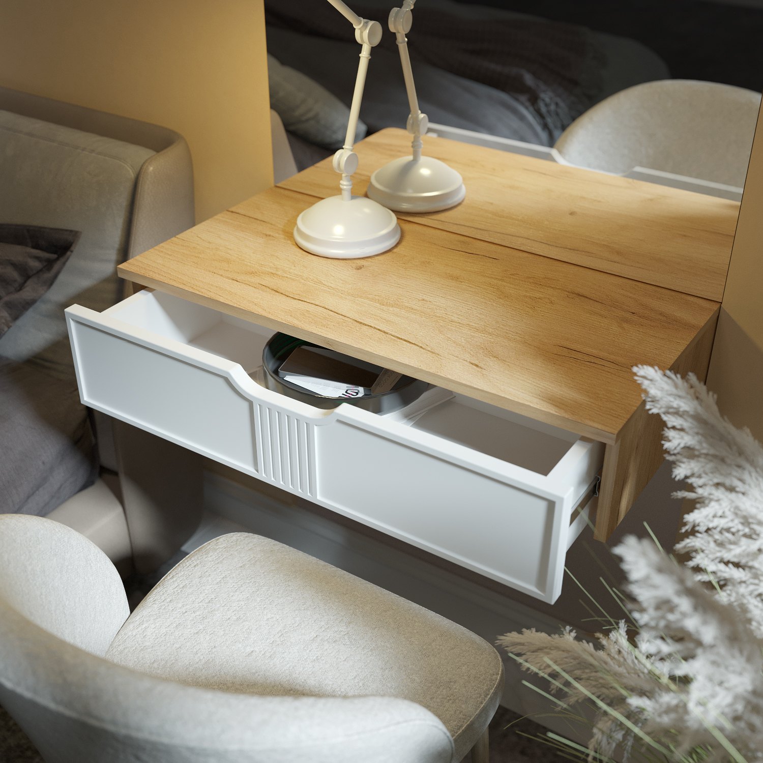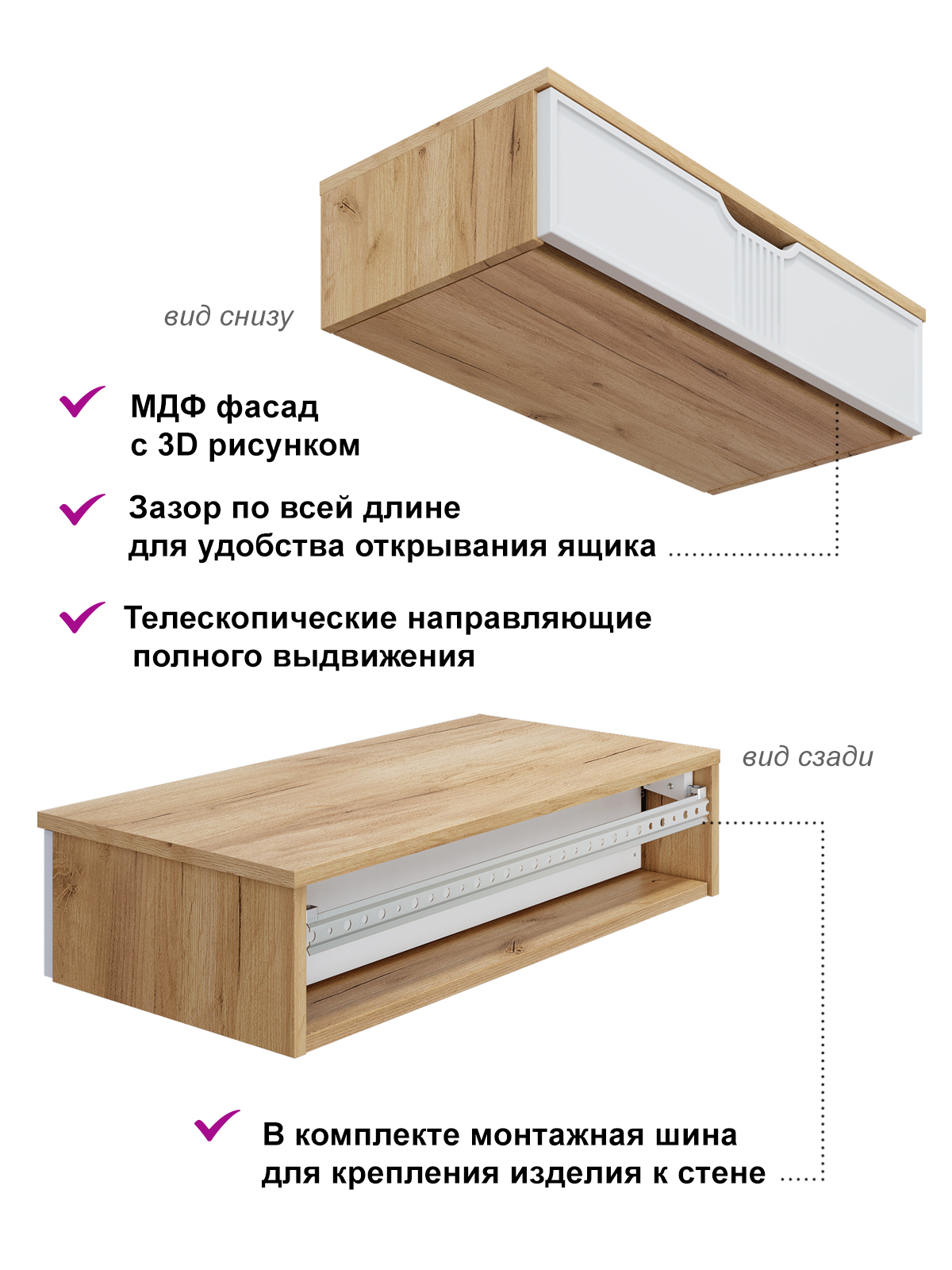 Тумба подвесная/консольный столик Эмилия ЭЛ-22 с выдвижным ящиком идеально впишется в любой интерьер. Изящный дизайн, функциональность и компактность, а так же его крепление на стену позволяют создать интересное дизайнерское решение и интерьер не будет выглядеть громоздко. Отсутствие лишних деталей делает консоль легкой и практичной не загромождает пространство визуально. Несмотря на компактный размер столешница позволяет разместить ноутбук, зеркало, косметичку, настольную лампу или все для учебы и творчества. Установить можно практически в любом помещении: в детской комнате, в гостиной, в прихожей, на балкон или лоджию как полка для зеркала, для ключей, для создания индивидуального интерьерного решения. Дополнив тумбу зеркалом ЭЛ-24 вы создадите прекрасный комлект. Фурнитура: телескопические направляющие полного выдвижения без доводчиков. Важная информация. Мебель доставляется в разобранном виде, в упаковках.