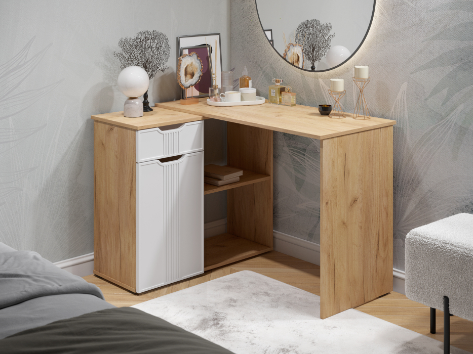 Угловой стол Эмилия ЭЛ-47 станет отличным местом для работы. В выдвижном ящике можно хранить блокнот, канцелярские принадлежности. Стильный дизайн позволит разместить в любом современной интерьере. Расположение тумбы только с левой стороны. Свес крышки в 20 мм обеспечит прилегание к стене с любым плинтусом. Стол изготовлен из ЛДСП 16 мм, фасады МДФ 16 мм. Дно ящика двп 3 мм. Высота опоры 20 мм. Фурнитура: телескопические направляющие полного выдвижения без доводчиков, петли с доводчиками.