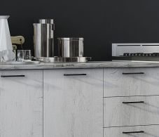 - Нижние корпуса: 500 мм под мойку – 1 шт. 600 мм с распашными фасадами – 1 шт. 400 мм с выдвижными ящиками – 1 шт. Высота 706 мм, глубина 450 мм. Материал ЛДСП.