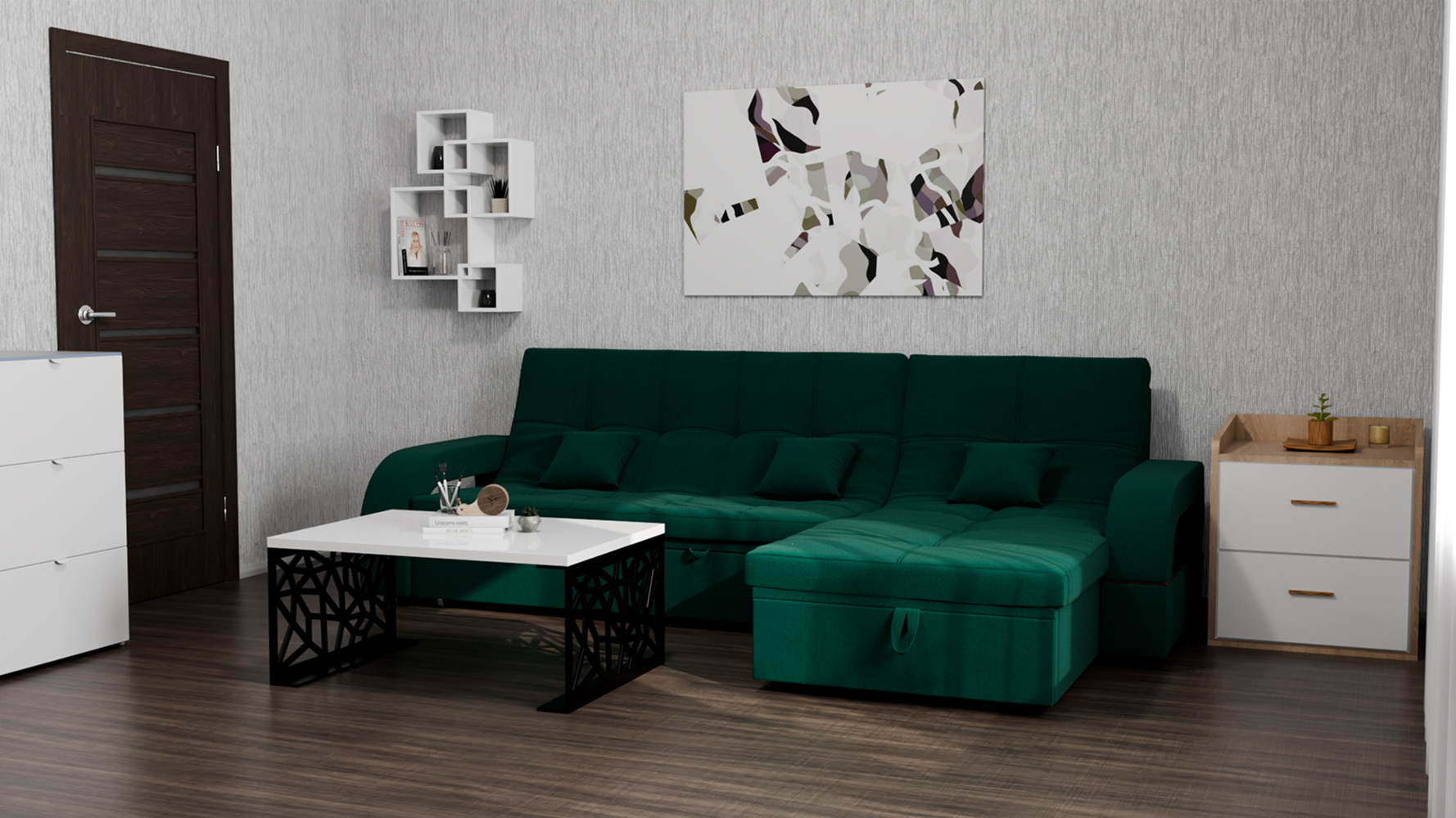 Он имеет высоту 97 см, ширину 268 см и глубину 175 см. Диван обладает универсальным расположением угла, что позволяет его использовать в любом помещении.